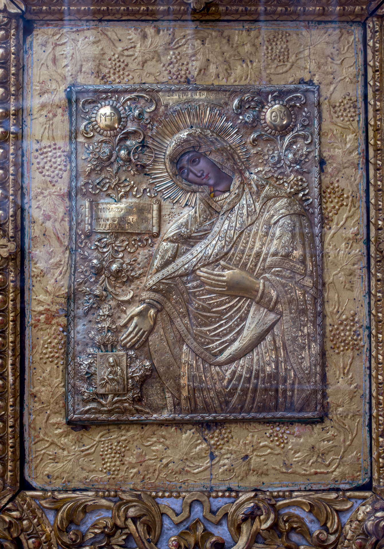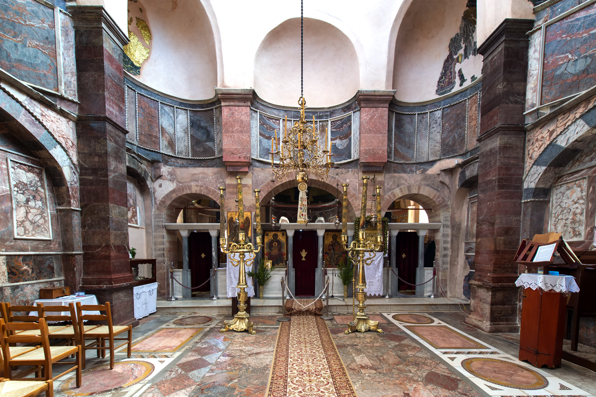Die Mosaike des Katholikons, die heute teilweise gehalten sind, datieren von den Jahren 1049-1055, d.h. sie wurden nach dem Tod Konstantinos in den Jahren, wann Theodora Kaiserin war, vollendet. Mosaike gibt es auch an den oberen Teilen der Wände der Hauptkirche und an der kleinen Kuppel des Innennarthex. Die senkrechten Wände des Monumentes waren mit bunter Marmorverkleidung  bedeckt, die im Jahr 1822 zerstört wurde und heute durch gemalten Marmormörtel ersetzt ist. Von den Mosaiken sind viele Darstellungen gehalten: im dreiteiligen Bema sind Muttergottes an der Nische des Bemas und die Erzengel an den Nischen der Prothesis und des Diakonikons dargestellt. In der Hauptkirche befinden sich Darstellungen aus Christi Leben (die Taufe, die Verklärung, die Kreuzigung, die Kreuzabnahme, die Himmelfahrt). Darstellungen aus dem Leben von Christus gibt es auch im Innennarthex an der Nordwand (Lazarus Auferstehung, der Einzug Jesus Christi in Jerusalem, die Fußwaschung beim letzten Abendmahl) und an der Südwand (das Gebet in Gestemani, der Verrat, die Himmelfahrt und das Pfingsten). Im Zentrum der kleinen Kuppel des Innennarthex ist Muttergottes dargestellt und an den übrigen Wänden stehen die Darstellungen von Heiligen. Im Außennarthex sind Teile von Fresken aus der Zeit von Paläologen und aus den postbyzantinischen Jahren gehalten. Auf dem Boden der Kirche sind byzantinische Mosaike gehalten.