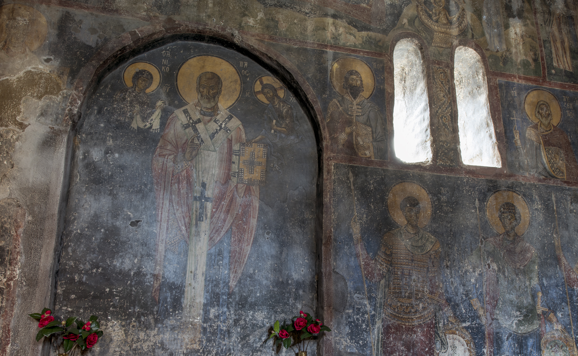 Στο εσωτερικό του ναού υπήρχε αξιόλογος τοιχογραφικός διάκοσμος, που διατηρείται σε καλή κατάσταση. Περιλαμβάνει, μεταξύ άλλων, στον κυρίως ναό σκηνές από τη ζωή του Χριστού, καθώς και ολόσωμες μορφές αγίων στρατιωτικών και αγίων ιατρών. Τον νάρθηκα κοσμούν σκηνές από τον βίο του αγίου Νικολάου, ολόσωμοι άγιοι και άγιες και η παράσταση της Δέησης, με τον Χριστό να εικονίζεται με γεροντική μορφή ως Παλαιός των Ημερών. Με βάση την τεχνοτροπία τους οι αγιογραφίες χρονολογούνται περίπου στα τέλη του 12ου αιώνα και αποτελούν ένα από τα σημαντικότερα σύνολα της περιόδου των Κομνηνών (1081-1185).