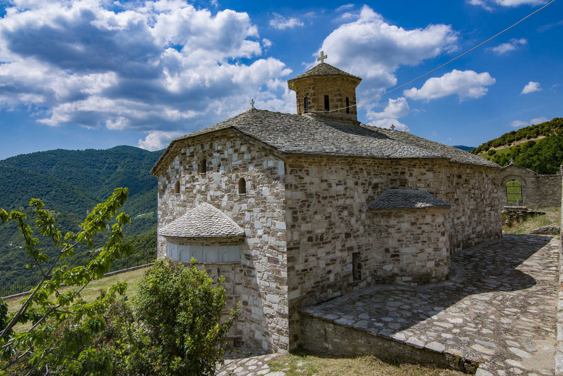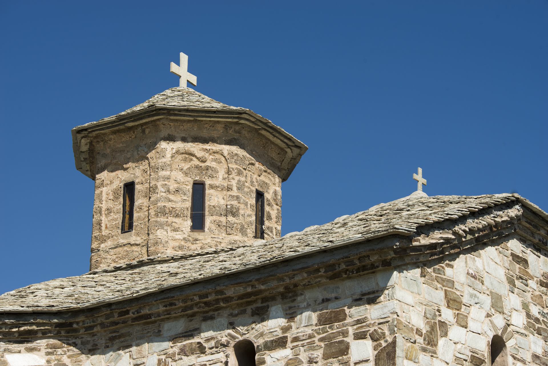 Από το αρχικό συγκρότημα σήμερα σώζεται το καθολικό και ο εντυπωσιακός πύργος που αποτελούσε μέρος της οχύρωσης της μονής. Ο ναός κτίστηκε το 1806 στη θέση παλαιότερου, και είναι χαρακτηριστικό ότι στην κατασκευή του έχει χρησιμοποιηθεί το ίδιο οικοδομικό υλικό. Είναι σταυροειδής εγγεγραμμένος με νάρθηκα, και τρούλο που στηρίζεται σε τέσσερις κίονες, ενώ ανήκει στον αθωνικό τύπο, δηλαδή σχηματίζει κόγχες και στους πλάγιους τοίχους. Η τοιχοποιία του ακολουθούσε το λεγόμενο ατελές πλινθοπερίκλειστο σύστημα, με αδρά πελεκημένους λίθους και καλύτερα επεξεργασμένους πωρόλιθους στις γωνίες, αλλά σήμερα έχει αλλοιωθεί από μεταγενέστερες επεμβάσεις.