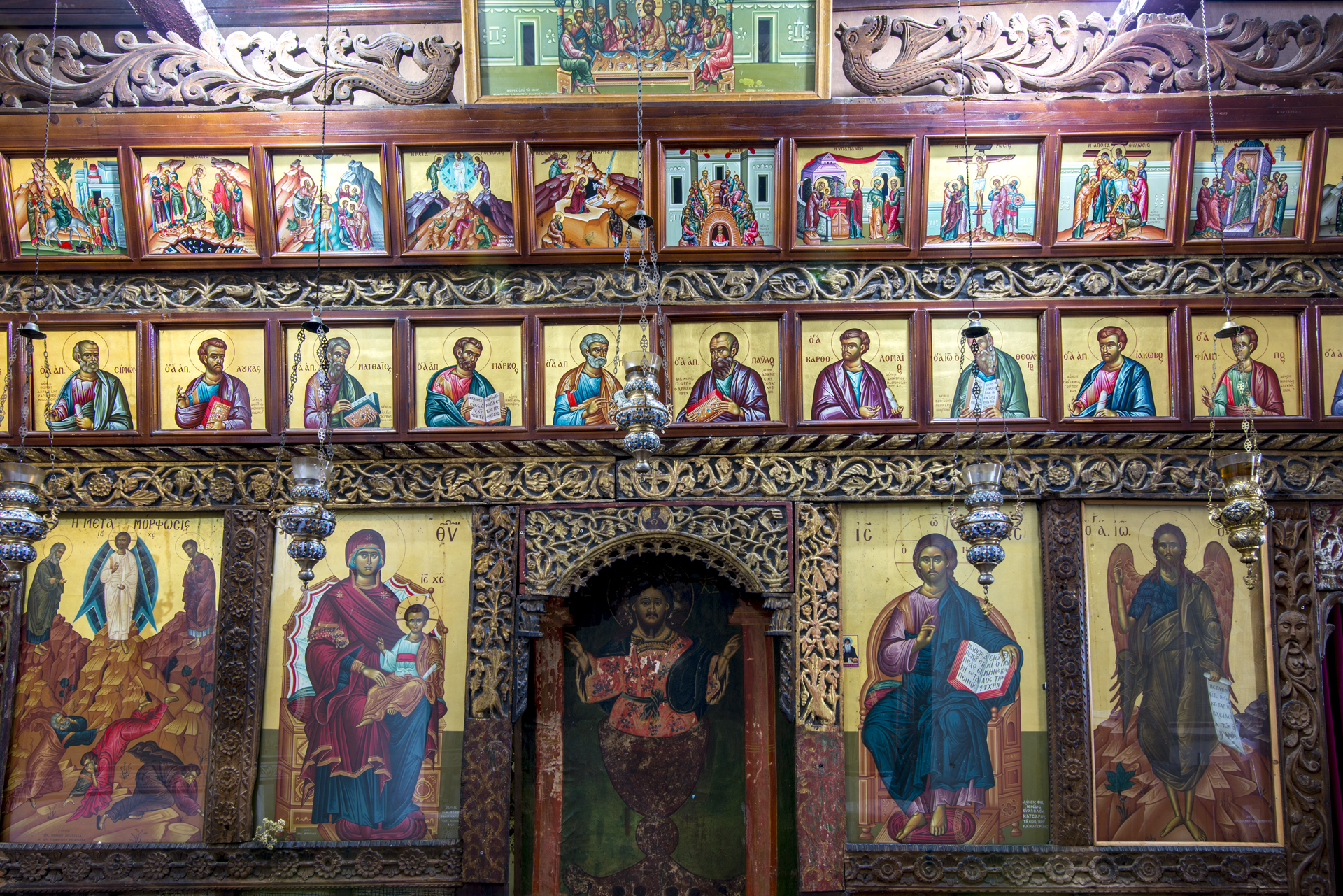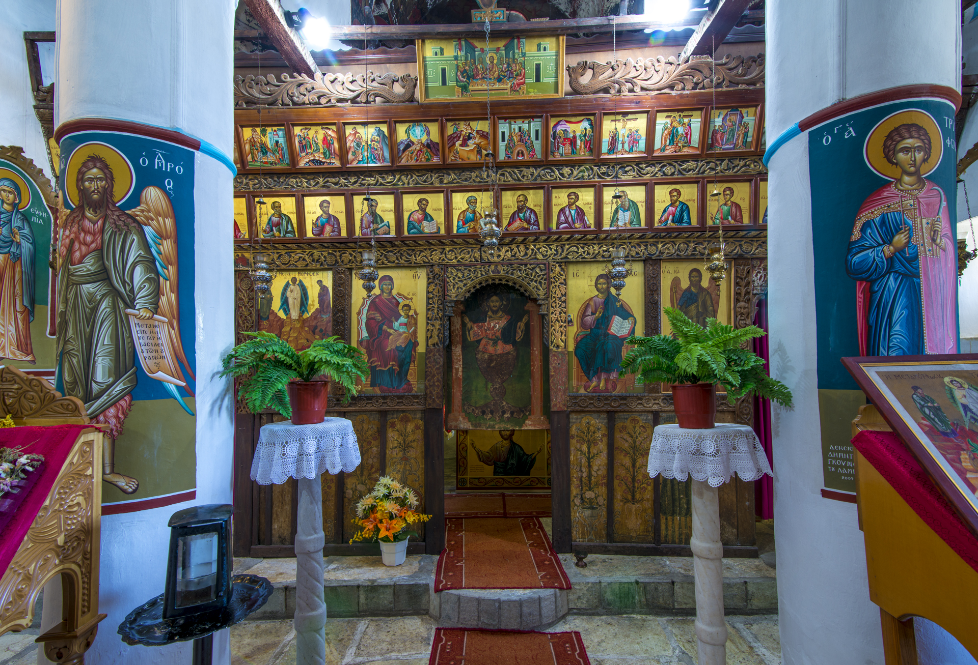 Στο εσωτερικό του σώζονται λίγες τοιχογραφίες, καθώς η αγιογράφηση του ναού ξεκίνησε το 1828 αλλά δεν ολοκληρώθηκε, και περιορίστηκε στο ιερό, ενώ στους υπόλοιπους χώρους έχει γίνει μόνο η προετοιμασία των μορφών. Το τέμπλο είναι ξυλόγλυπτο και έχει υποστεί αρκετές μετατροπές, ωστόσο περιλαμβάνει μία επιγραφή που αναφέρει ως έτος κατασκευής το 1626, προέρχεται δηλαδή από τον πρώτο ναό. Ο πύργος, που υψώνεται στη βορειοανατολική γωνία, κτίστηκε το 1801 και στέγαζε το ηγουμενείο και έναν ημιυπόγειο αποθηκευτικό χώρο. Ήταν τριώροφος, με εσωτερικές ξύλινες σκάλες που δεν σώζονται σήμερα, η στέγη του ήταν θολωτή, σκεπασμένη με πλάκες, και στους τοίχους του είχε πολεμίστρες. Επίσης, από το παλαιό συγκρότημα σώζεται και το αγίασμα.