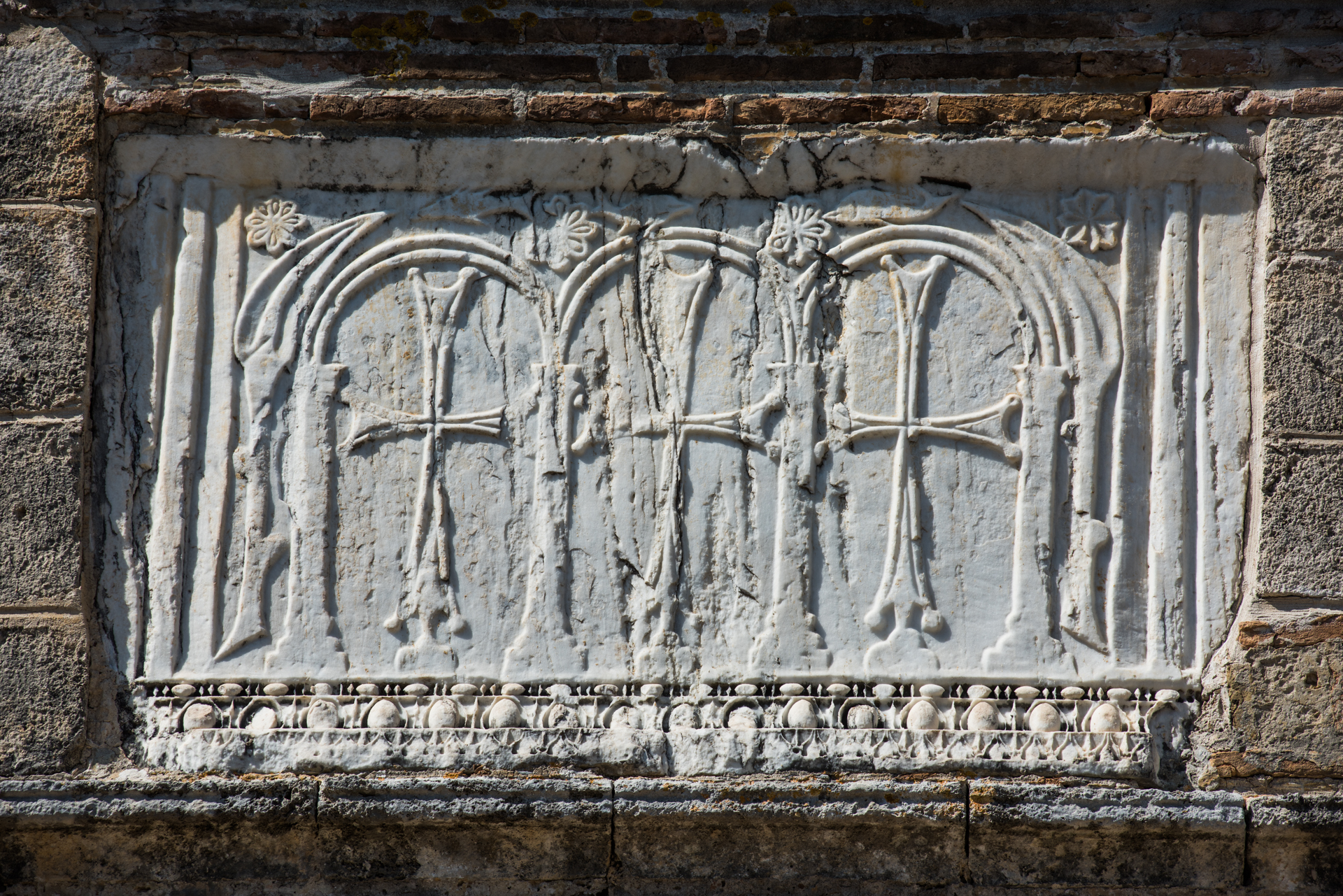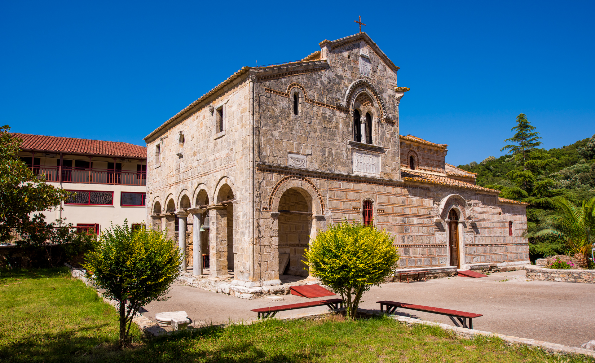 Το καθολικό, που δεσπόζει στο κέντρο της αυλής του μοναστηριακού συγκροτήματος, θεωρείται από τα ομορφότερα δείγματα αρμονικού συγκερασμού της ανατολικής και της δυτικής εκκλησιαστικής τέχνης. Πρόκειται για μεγάλη τρίκλιτη ξυλόγεστεγη βασιλική με νάρθηκα και εξωνάρθηκα, κτισμένη από κοκκινωπό πωρόλιθο, με το πλινθοπερίκλειστο σύστημα τοιχοποιίας, με διπλές πλίνθους γύρω από κάθε λίθο. Στους τοίχους της έχουν ενσωματωθεί λίθοι και ανάγλυφα από παλαιοχριστιανικό κτίσμα που υπήρχε στην περιοχή. Το ανατολικό τμήμα του ναού θεωρείται παλαιότερο, του τέλους του 12ου ή των αρχών του 13ου αιώνα, ενώ το δυτικό, με τον νάρθηκα και τον εξωνάρθηκα, αναμορφώθηκε από τους Φράγκους κατακτητές σύμφωνα με δυτικά αρχιτεκτονικά πρότυπα. Σε αυτούς οφείλεται και ο εντοιχισμός του ιδιόμορφου ηλιακού ρολογιού από λευκό μάρμαρο στον εξωνάρθηκα. Το εσωτερικό του ναού είναι αγιογραφημένο με θαυμάσια έργα, των μέσων του 18ου αιώνα.