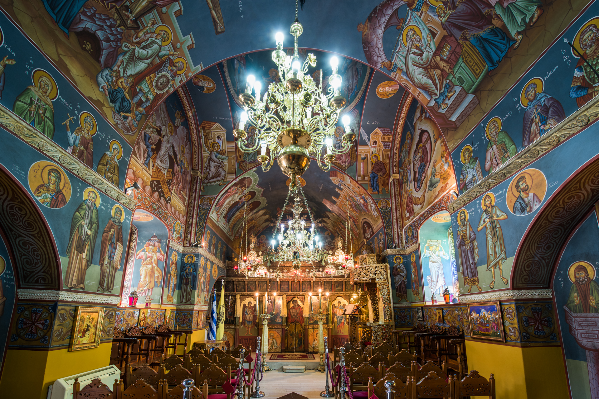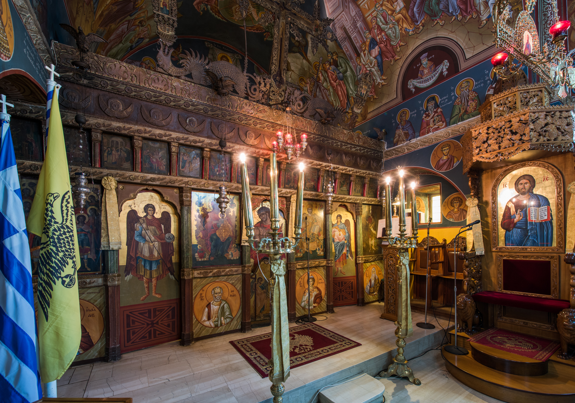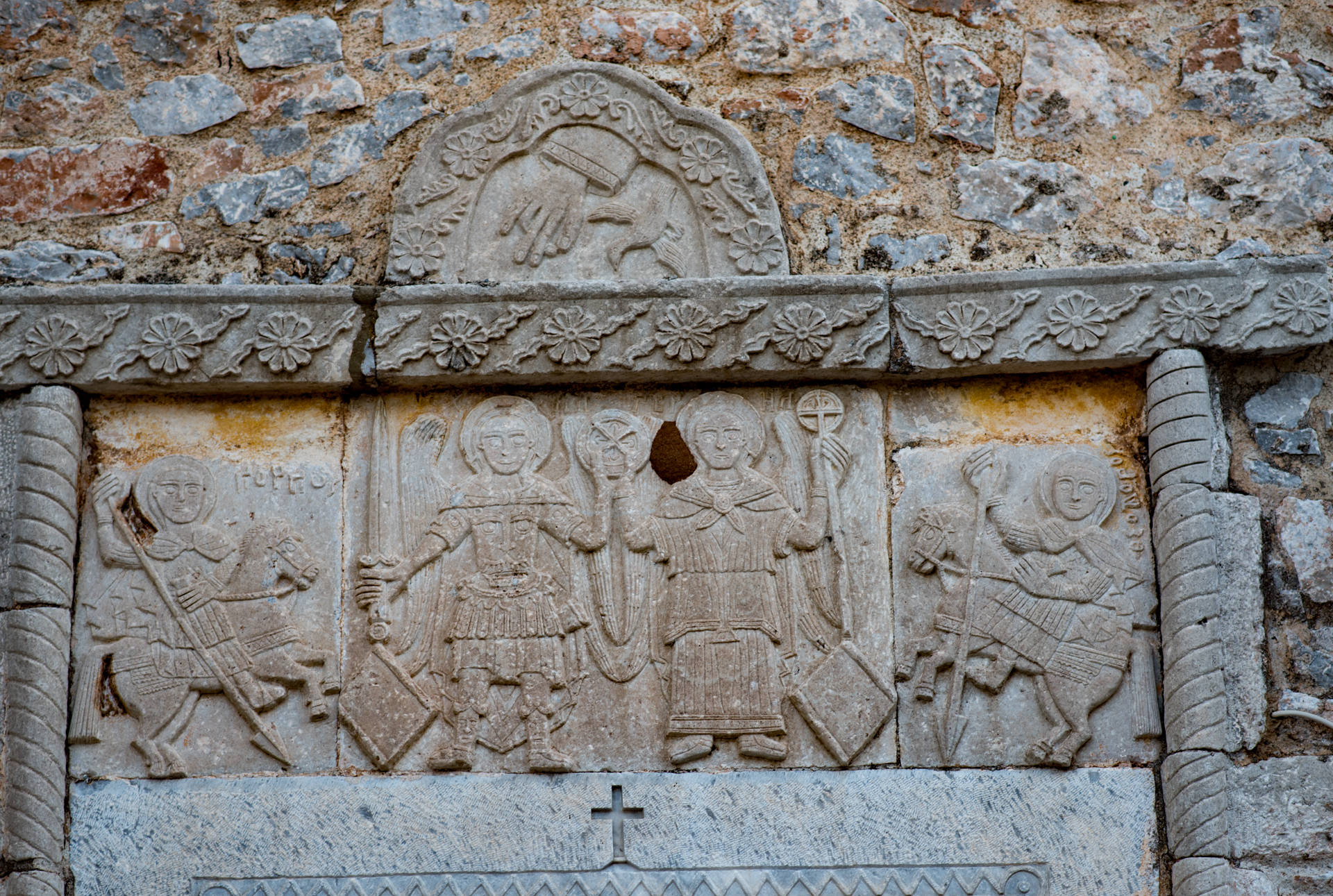 Ιδιαίτερο ενδιαφέρον παρουσιάζουν τα λιθανάγλυφα που διακοσμούν την πύλη του ναού και την αψίδα του ιερού, αντιπροσωπευτικά έργα λαϊκής τεχνοτροπίας του τέλους του 18ου αιώνα. Οι ανάγλυφες παραστάσεις επάνω από την είσοδο χρονολογούνται στο έτος 1798 και απεικονίζουν τους Ταξιάρχες Γαβριήλ και Μιχαήλ, και έφιππους τους αγίους Γεώργιο και Θεόδωρο, μορφές που σχετίζονται σαφώς με τον πολεμικό χαρακτήρα των κτητόρων. Η διακόσμηση της αψίδας αποτελείται από μια εξαίρετη σειρά μικρών αναγλύφων που απεικονίζουν τον ζωδιακό κύκλο. Στο εσωτερικό του ναού ξεχωρίζει το γλυπτό τέμπλο.