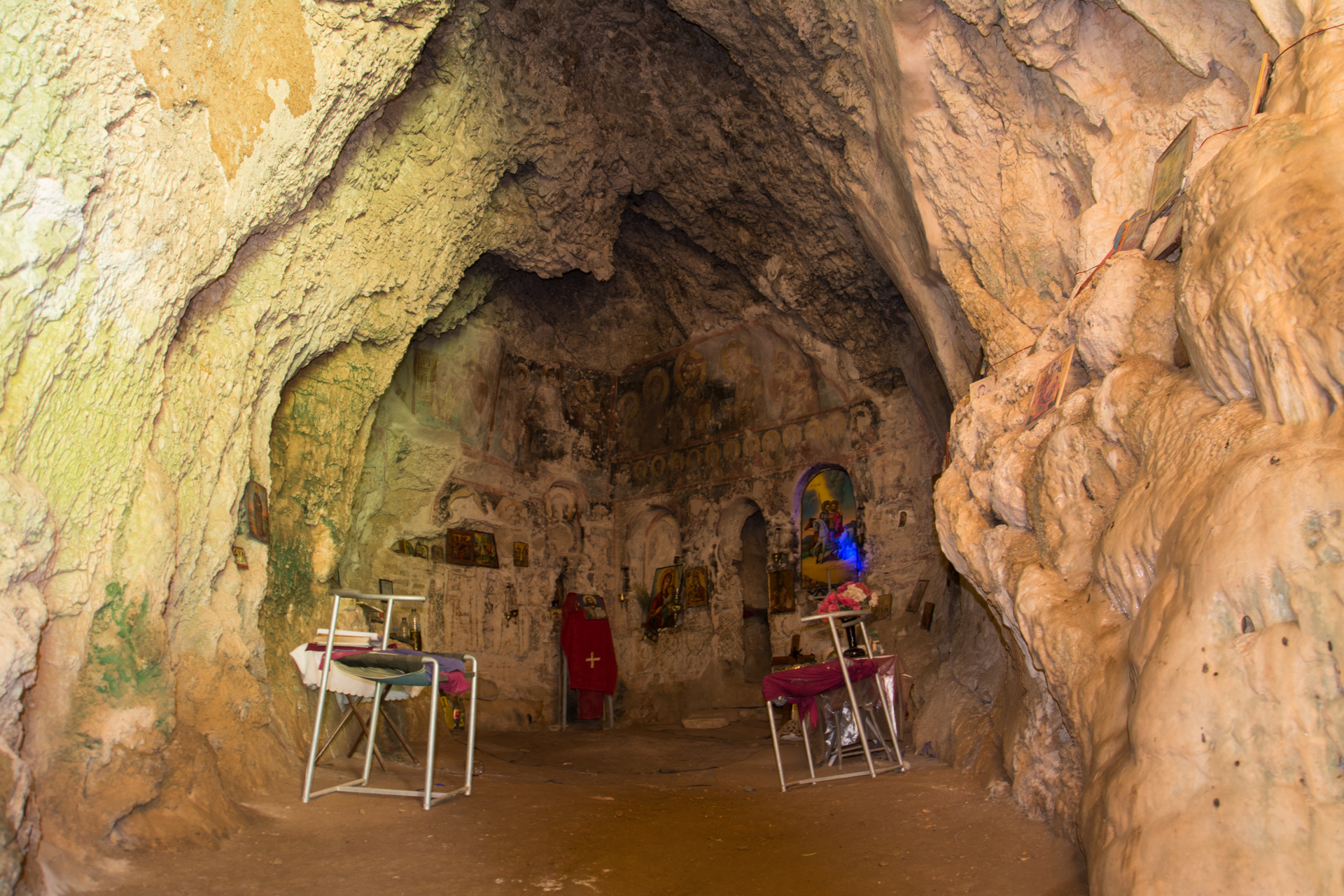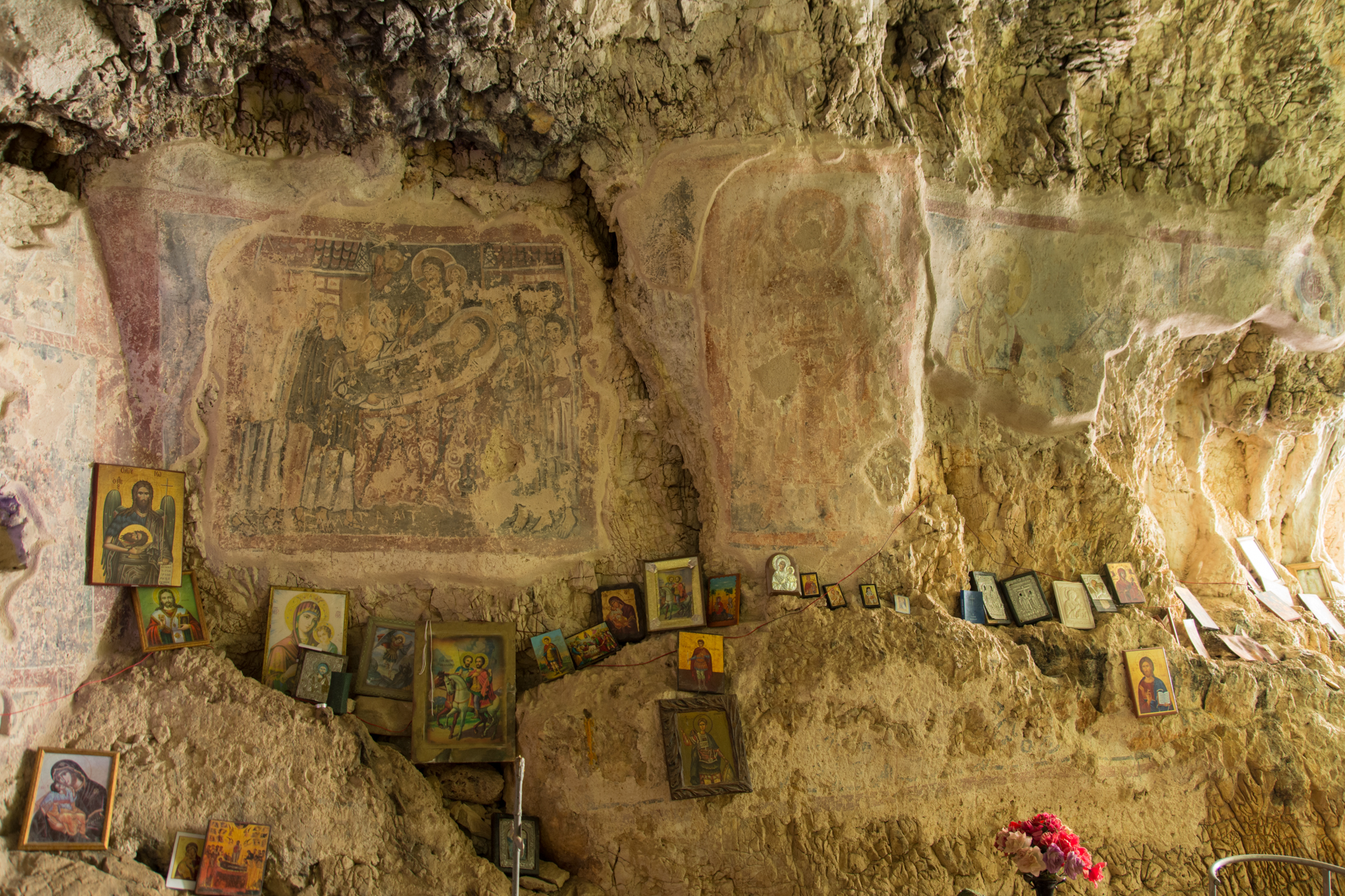 Ο ναός είναι όλος διακοσμημένος με τοιχογραφίες που καλύπτουν τα πλάγια τοιχώματα του βράχου, το τέμπλο και το ιερό βήμα και διακρίνονται σε δύο φάσεις. Κυρίαρχο θέμα τους είναι η ζωή της Θεοτόκου, γεγονός που δείχνει ότι αρχικά ο ναός πρέπει να ήταν αφιερωμένος στην Παναγία. Οι παλαιότερες αγιογραφίες χρονολογούνται στον 11ο αιώνα και σώζονται πιο αποσπασματικά. Ανάμεσά τους ξεχωρίζουν μια μεγάλη σύνθεση της Κοίμησης της Θεοτόκου και η μορφή του Αρχάγγελου, στη νότια πλευρά. Οι νεότερες χρονολογούνται στο τέλος του 12ου ή στις αρχές του 13ου αιώνα, αποδίδονται σε ώριμο καλλιτέχνη και χαρακτηρίζονται για την υψηλή αισθητική ποιότητά τους, που τις συνδέει με την τέχνη της Κωνσταντινούπολης. Αντιπροσωπευτικές είναι οι μνημειακές παραστάσεις της ένθρονης βρεφοκρατούσας Παναγίας και της Δέησης, που κυριολεκτικά δεσπόζουν στον περιορισμένο χώρο.