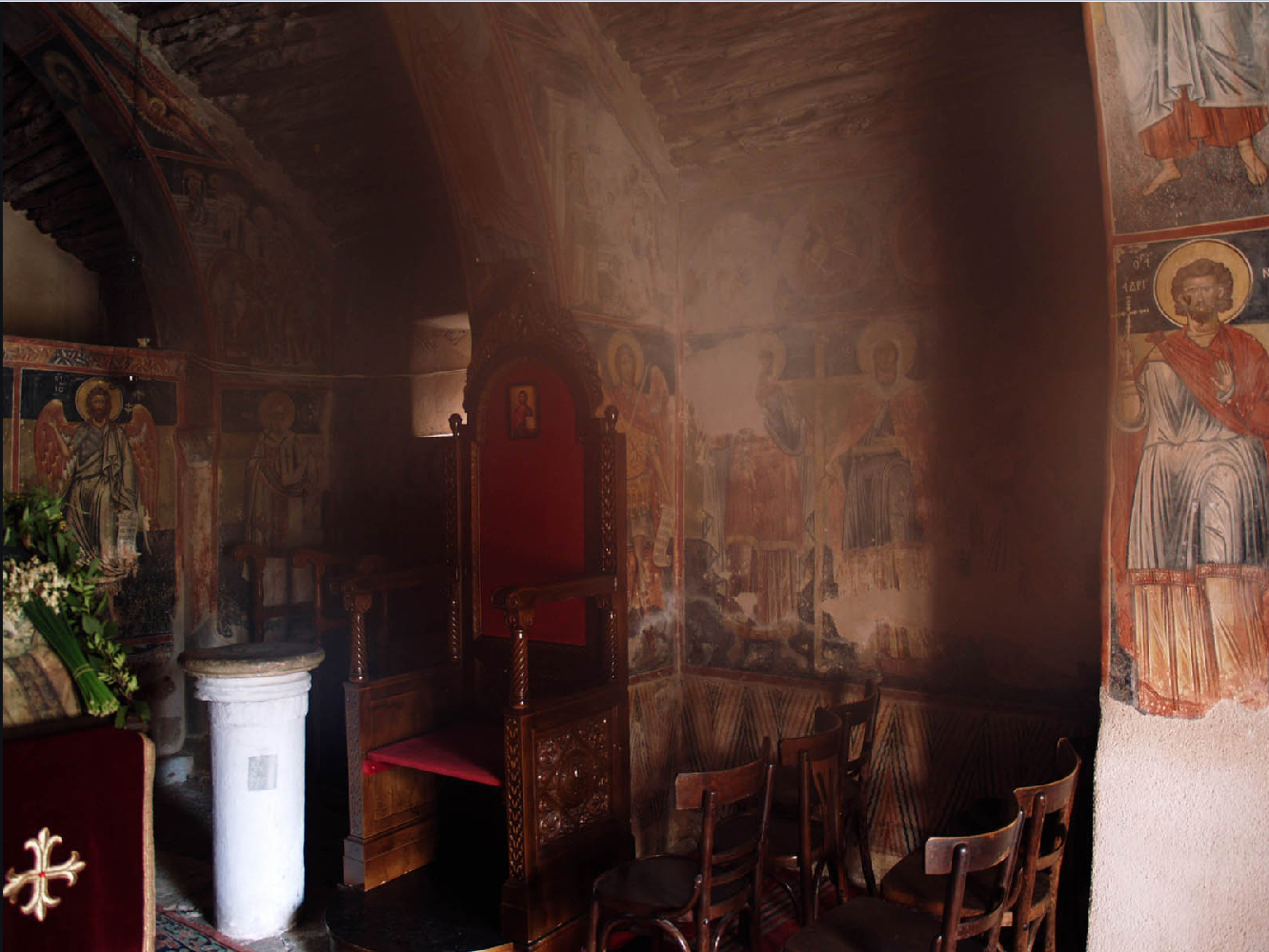 Ελάχιστα είναι τα φωτιστικά ανοίγματα του ναού (δύο πολεμιστροειδή, όπως αναφέραμε), πράγμα που συμβάλλει σε μια κατανυκτική ατμόσφαιρα στο εσωτερικό του.