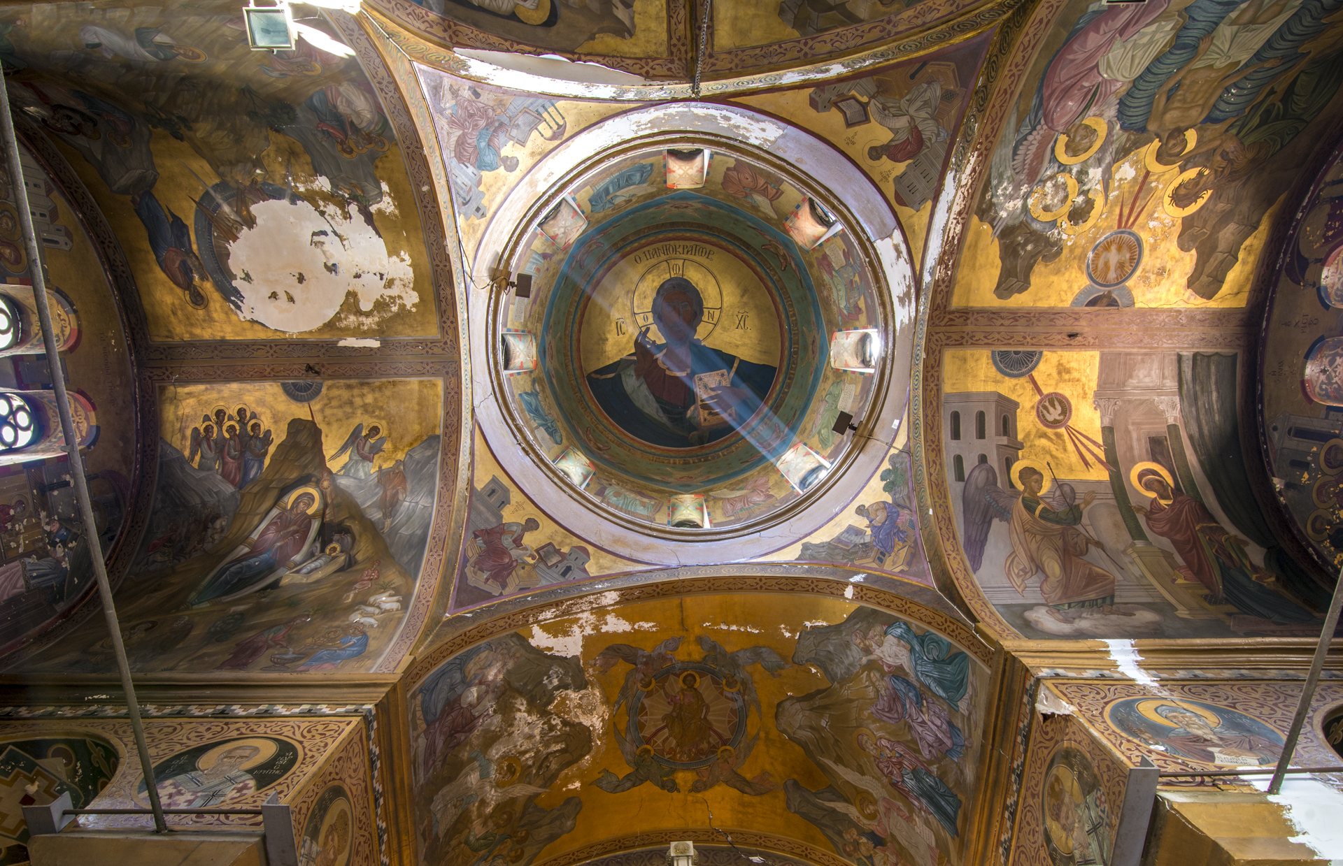Σε κάποια σημεία, όπως στη νότια κεραία του σταυρού, είναι ορατή η τοιχοποιία της βυζαντινής φάσης του ναού καθώς και τα κουφικά κοσμήματα που σώζονται μέχρι σήμερα. Ορατή είναι και η μεικτή λιθοδομή της τοιχοποιίας στο κάτω μέρος της κόγχης του Ιερού, η οποία παρουσιάζει διαφορές από τον υπόλοιπο ναό και πιθανώς ανήκει σε πρότερη οικοδομική φάση του ναού. Συγκεκριμένα, στους ορθογωνισμένους λίθους, σε πολλές περιπτώσεις δεν παρεμβάλλονται συνεχείς οριζόντιες σειρές τούβλων, ενώ στους κάθετους αρμούς παρεμβάλλονται δύο σειρές από οριζόντια τοποθετημένα τούβλα.