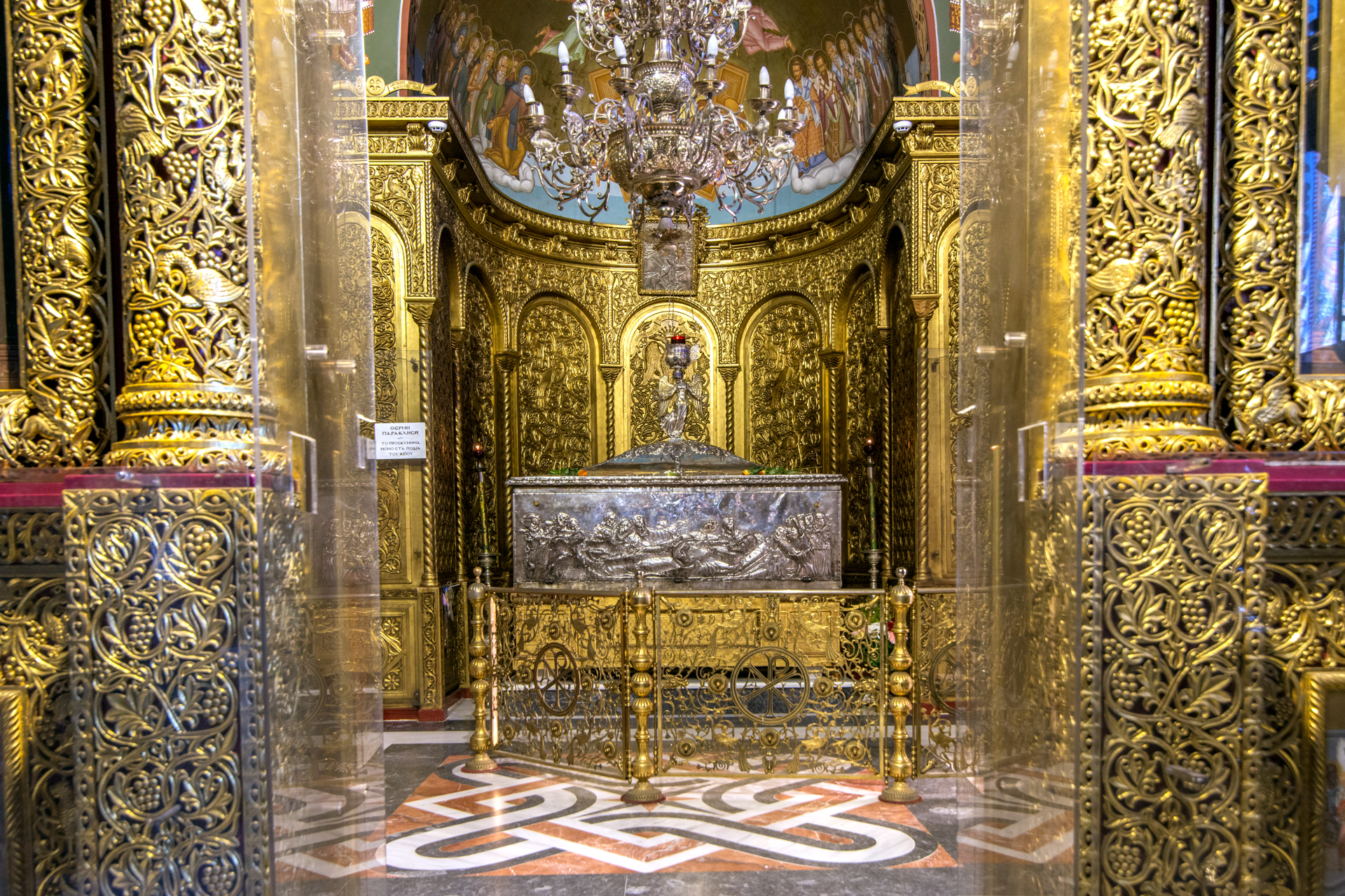 Στο εσωτερικό του φυλάσσονται σημαντικά κειμήλια. Οι σπουδαιότεροι θησαυροί του είναι η ασημένια λάρνακα στην οποία φυλάσσεται το ιερό λείψανο του αγίου, και οι εικόνες του τέμπλου με την ασημένια επένδυση, όλα έργα του 1829 του Ηπειρώτη αργυροχόου Γεωργίου Διαμαντή Μπάφα. Η λάρνακα βρίσκεται μέσα στο λεγόμενο «δωμάτιο του Αγίου», με την ξυλόγλυπτη επιχρυσωμένη επένδυση.