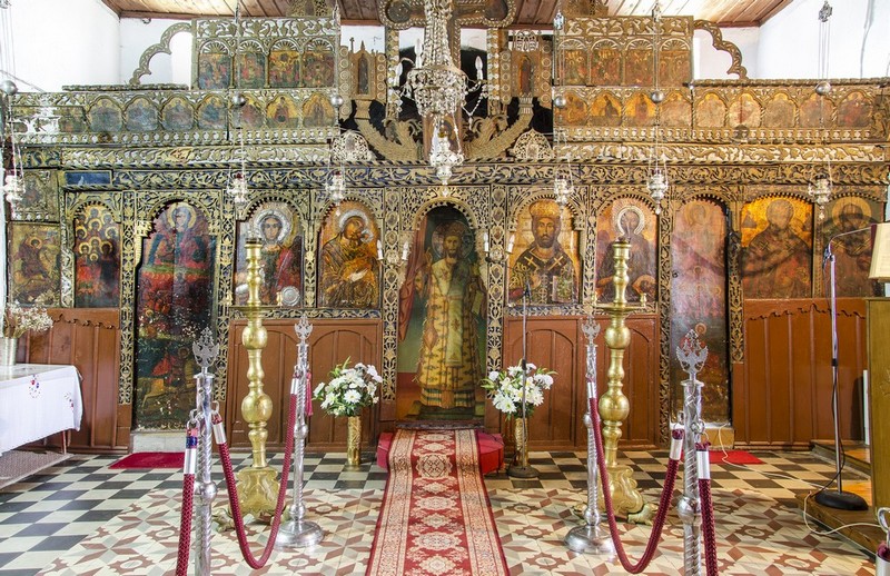 Στο εσωτερικό του ναού σημαντικά έργα είναι το ξυλόγλυπτο επιχρυσωμένο τέμπλο που κατασκευάσθηκε το 1615, καθώς και ο δεσποτικός θρόνος και τα προσκυνητάρια, που είναι διακοσμημένα με ένθετο ελεφαντόδοντο και φίλντισι. Μεγάλο ενδιαφέρον παρουσιάζουν και τα δύο παρεκκλήσια, που διατηρούν στο εσωτερικό τους αξιόλογες αγιογραφίες. Αυτό των Αγίων Αποστόλων αγιογραφήθηκε το 1753 από τον Νικόλαο και τον γιο του Αλέξιο από τα Ιωάννινα και διαθέτει όμορφο ξυλόγλυπτο τέμπλο των μέσων του 18ου αιώνα, ενώ το παρεκκλήσι του Αγίου Γεωργίου αγιογραφήθηκε το 1730.