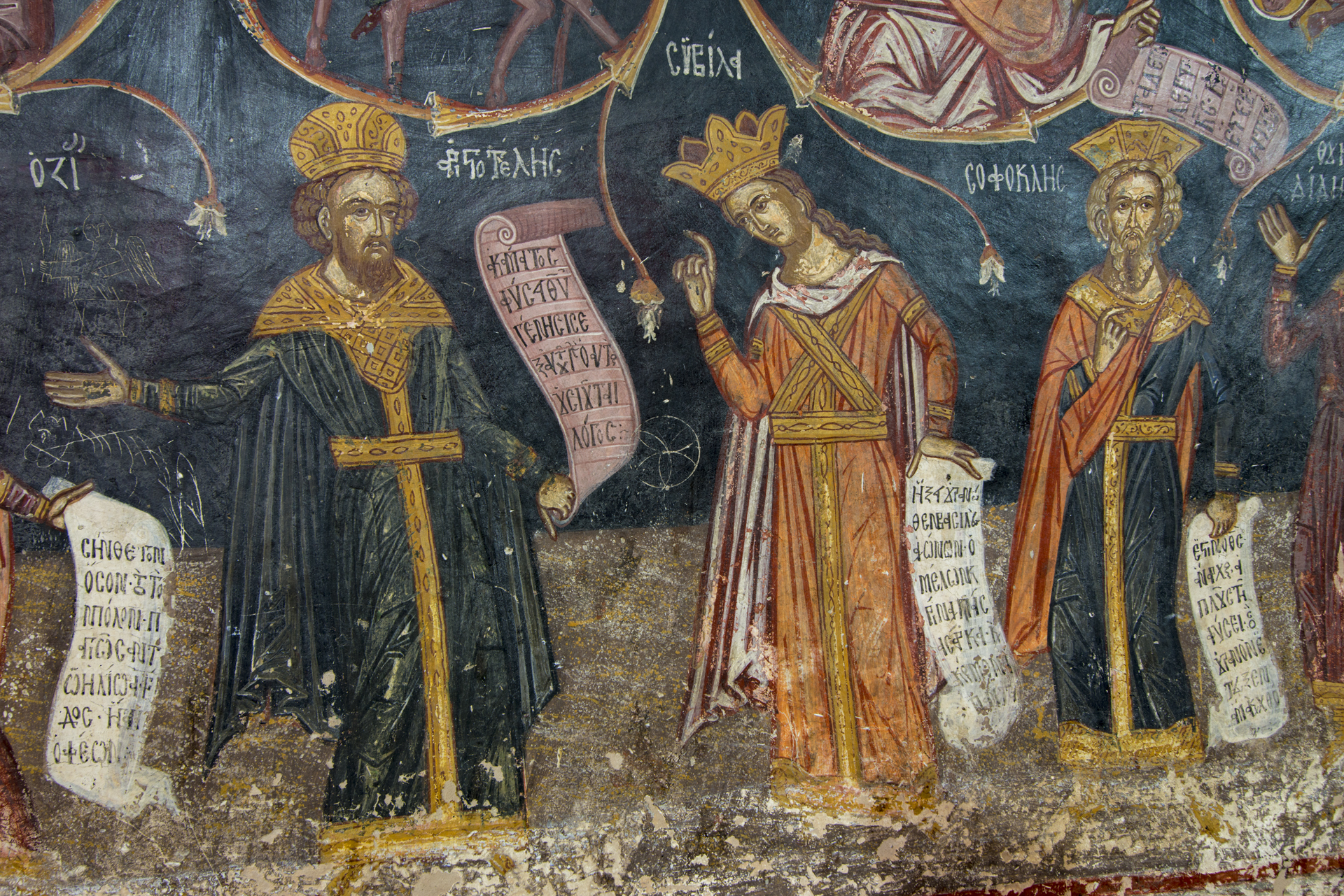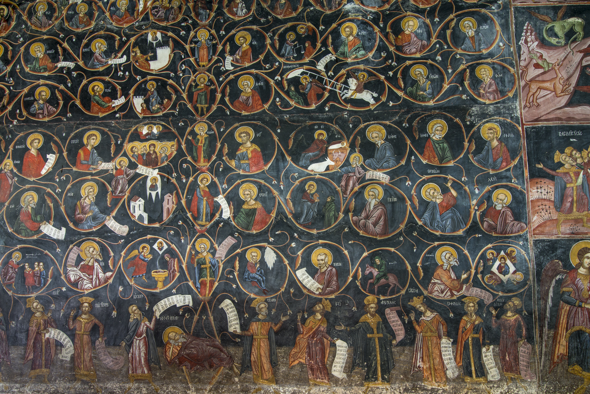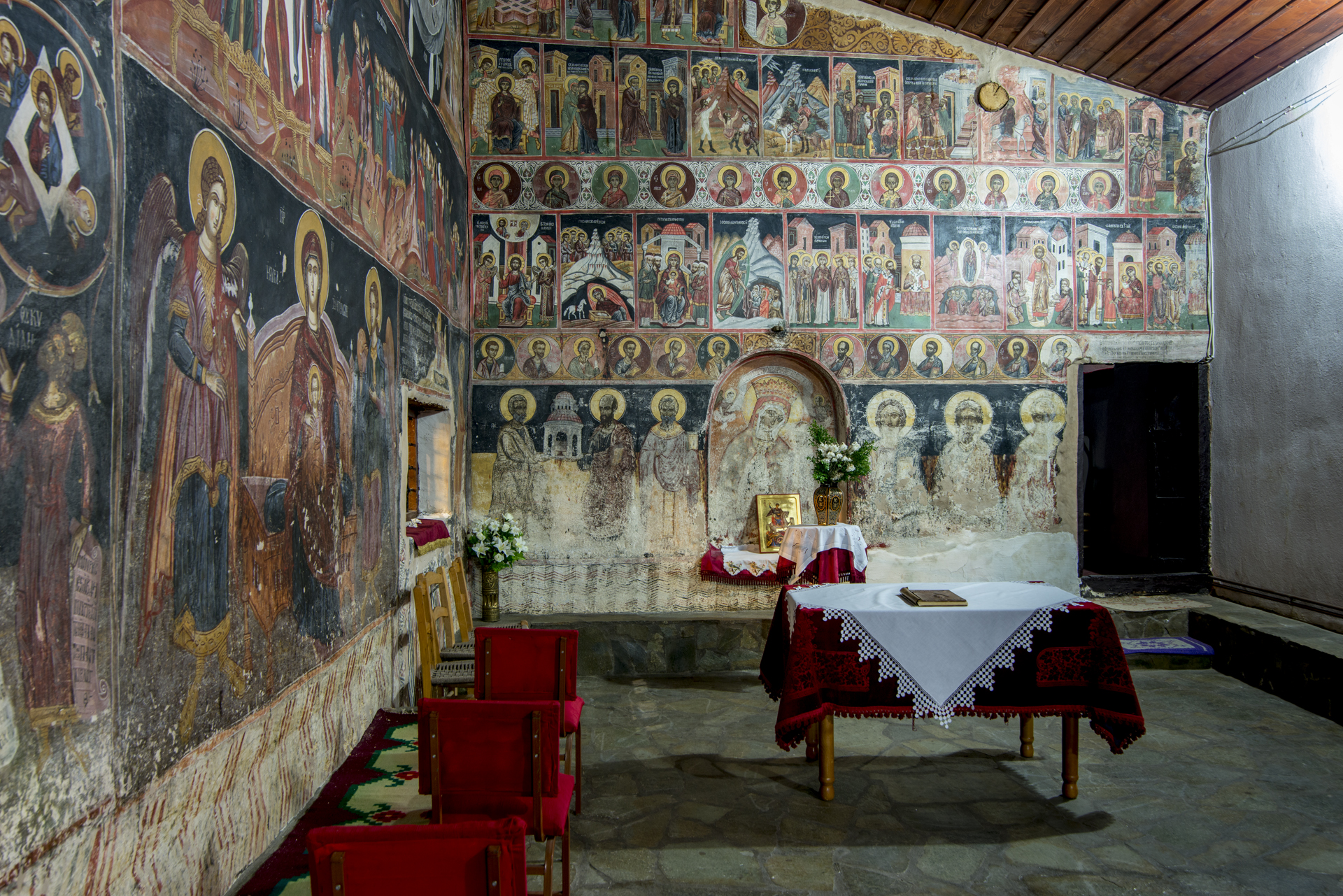 Η οροφή του εσωτερικά είναι ξύλινη και χωρίζεται σε τμήματα με διάφορα σχήματα και χρώματα. Το εσωτερικό του καλύπτεται με εξαιρετικής τέχνης τοιχογραφίες, που χρονολογούνται σε δύο κύριες φάσεις, στον 17ο και κυρίως στον 18ο αιώνα. Διακρίνονται για τα ποικίλα, σπάνια και πρωτότυπα θέματά τους, στα οποία οι αγιογράφοι προσπάθησαν να συνδυάσουν τη χριστιανική διδασκαλία με την αρχαία ελληνική φιλοσοφία. Ξεχωρίζουν η επιβλητική, πελώρια σύνθεση της «Ρίζας του Ιεσσαί», στη νότια στοά, που περιλαβμάνει συνολικά ενενήντα μορφές, ανάμεσα στις οποίες και αρχαίων Ελλήνων φιλοσόφων, και η παράσταση του ζωδιακού κύκλου, ενώ στη βόρεια στοά δεσπόζει ο «Καιρός του Χρόνου», που απεικονίζει τις φάσεις της ζωής του ανθρώπου. Είναι αξιοσημείωτο, ότι, καθώς ο νάρθηκας είναι μεταγενέστερη προσθήκη, οι παλαιότερες τοιχογραφίες ουσιαστικά κάλυπταν τους εξωτερικούς τοίχους του ναού.