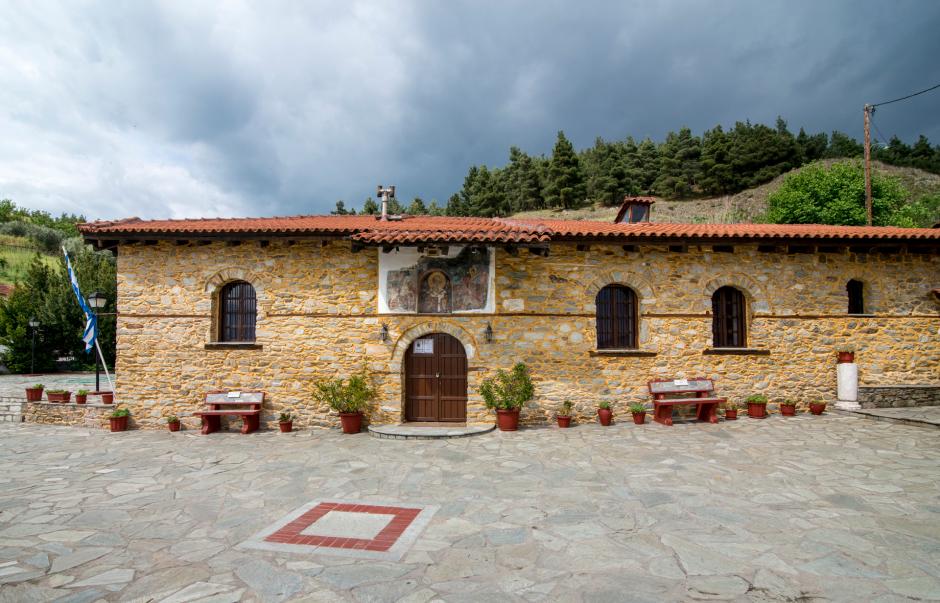 Οικοδομήθηκε το 1615, σύμφωνα με επιγραφή που σώζεται στο εσωτερικό του, και υπέστη μετατροπές τον 18ο αιώνα, ενώ φαίνεται ότι στον χώρο του υπήρχαν και καταλύματα μοναχών. Ο ναός είναι μονόχωρος, με νάρθηκα στις τρεις πλευρές του που καταλήγει μέσω των πλαϊνών στοών του σε δύο παρεκκλήσια, των Αγίων Αποστόλων και του Αγίου Γεωργίου.