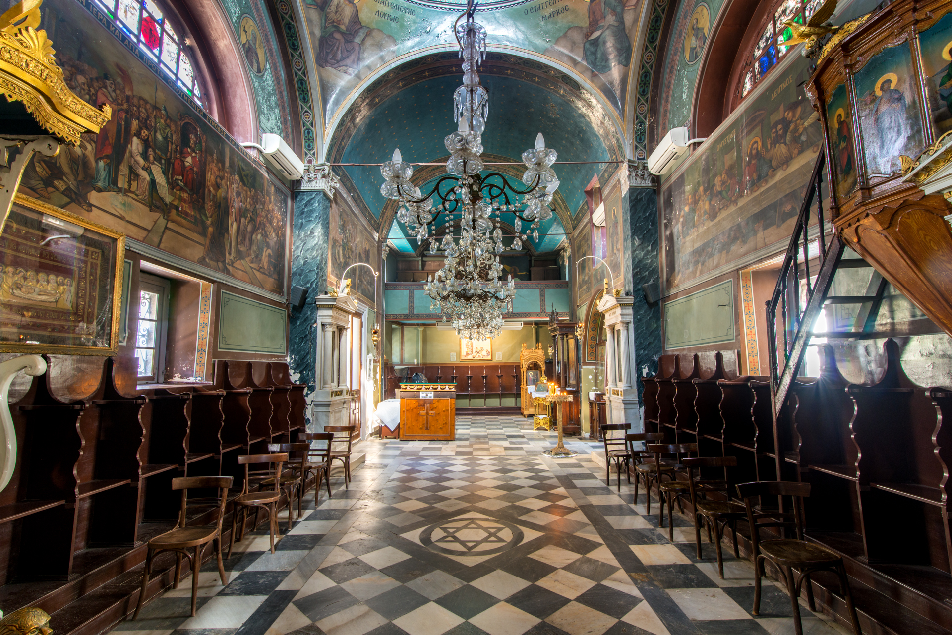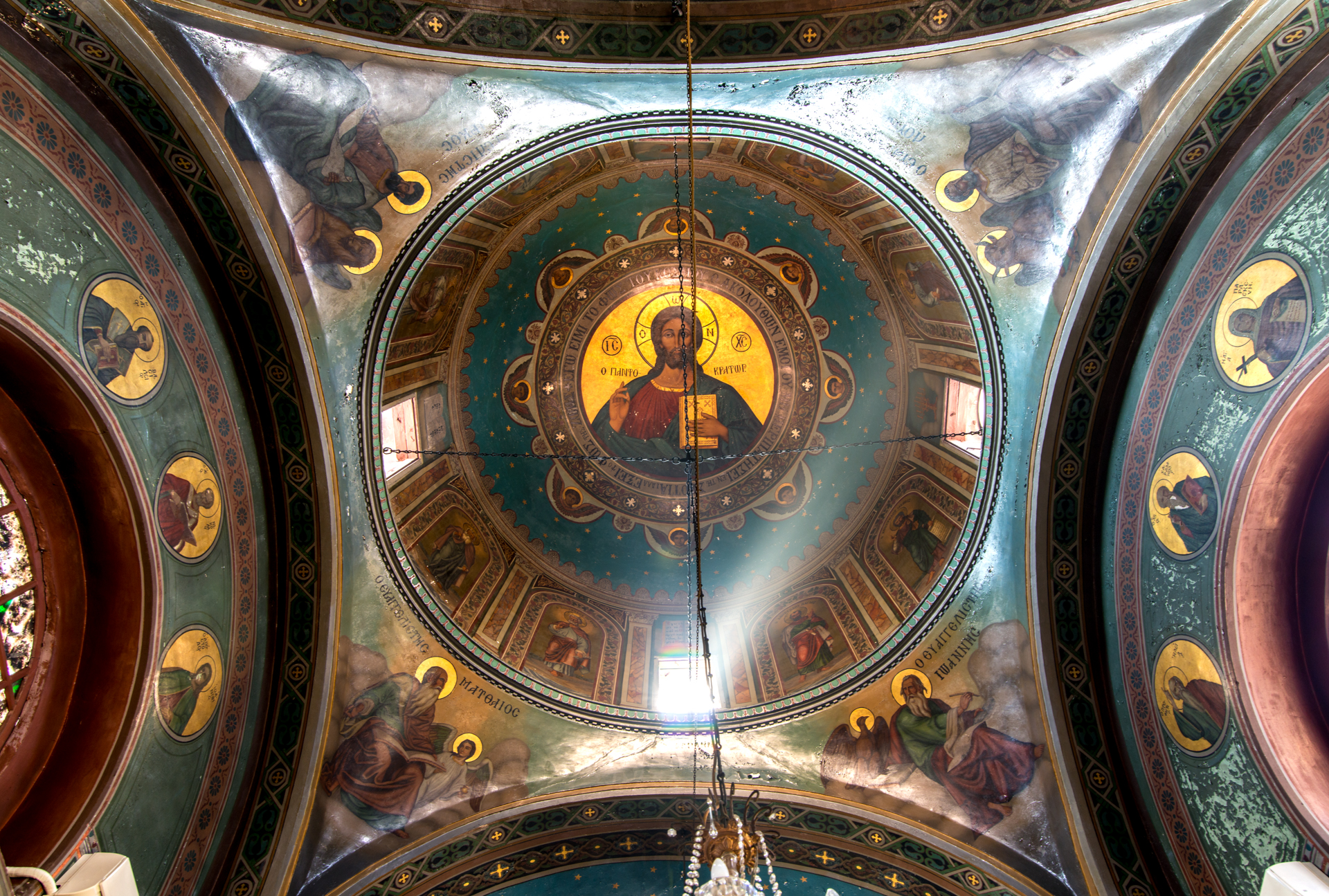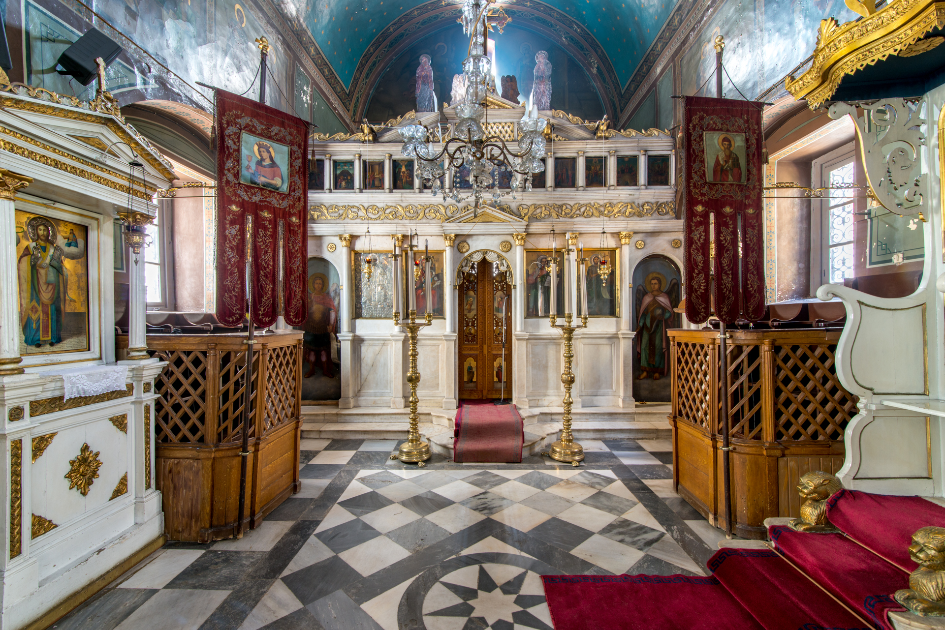 Στο εσωτερικό, η τοιχογράφηση του τρούλου έγινε το 1902. Στον δυτικό τοίχο απεικονίζεται η Α΄ Οικουμενική Σύνοδος στη Νίκαια της Βιθυνίας (325), στην οποία έλαβε μέρος ο άγιος Σπυρίδων.