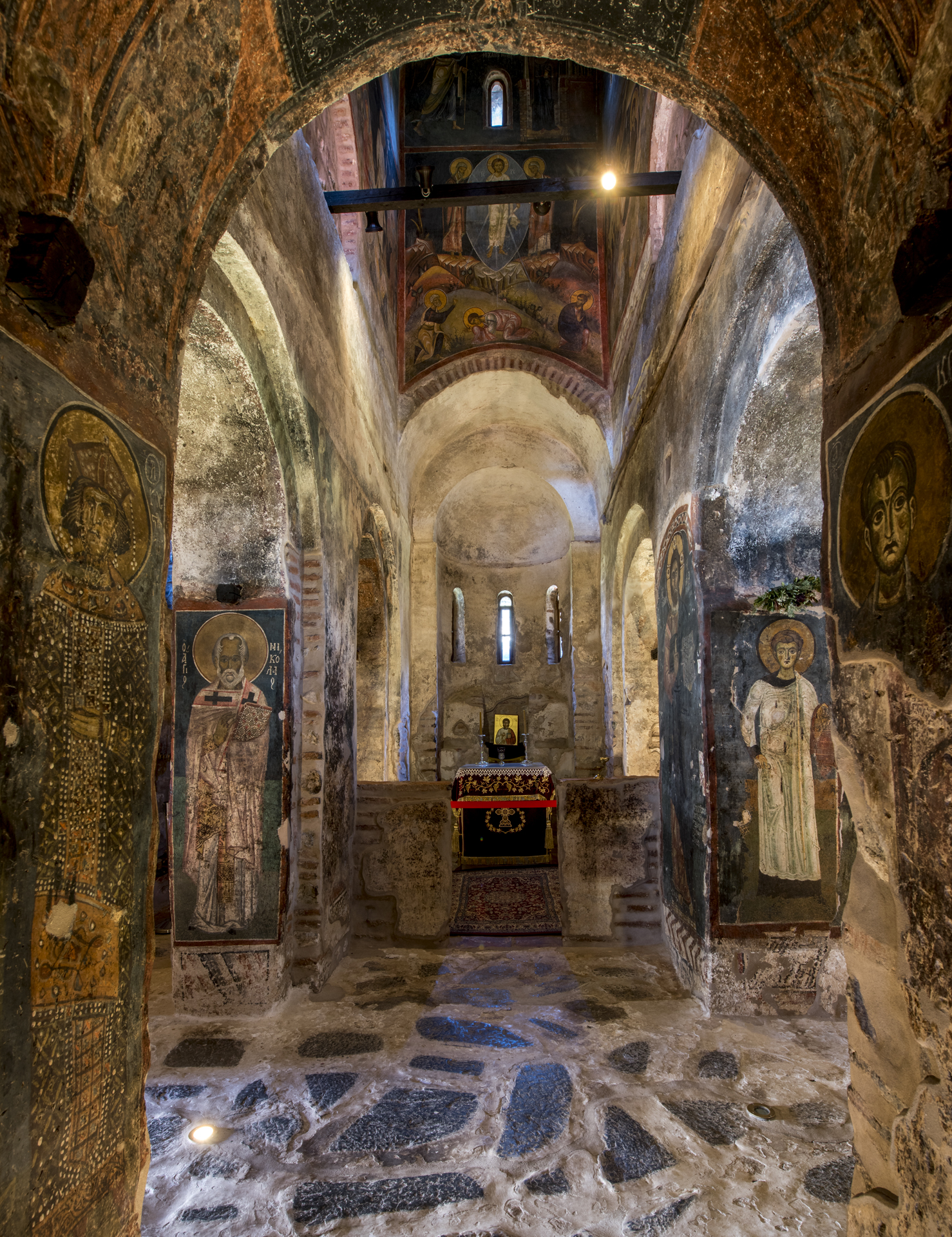 Ο ναός είναι διακοσμημένος με τοιχογραφίες που διακρίνονται σε τρεις διαφορετικές περιόδους. Στην πρώτη, που χρονολογείται στα τέλη του 9ου - αρχές του 10ου αιώνα, ανήκουν οι τοιχογραφίες στο ισόγειο του ναού και του νάρθηκα, καθώς και σε ορισμένα τμήματα του γυναικωνίτη. Ξεχωριστή θέση ανάμεσά τους καταλαμβάνουν οι σκηνές της Δευτέρας Παρουσίας στον νάρθηκα. Από τη δεύτερη περίοδο διατηρούνται κυρίως οι τοιχογραφίες στον ψηλό φωταγωγό, οι οποίες σύμφωνα με την τεχνοτροπία τους θα μπορούσαν να χρονολογηθούν στα τέλη του 12ου αιώνα και στις αρχές του 13ου αιώνα. Στην τρίτη περίοδο (τέλη του 13ου –αρχές 14ου αιώνα) εντάσσονται οι πολυάριθμες αναθηματικές τοιχογραφημένες εικόνες, που αποτελούν ιδιαίτερο χαρακτηριστικό του ναού. Από αυτές ξεχωρίζει η προσωπογραφία στον νάρθηκα του ιερέα Θεόδωρου Λημνιώτη που προσφέρει ομοίωμα του ναού στον άγιο Στέφανο.