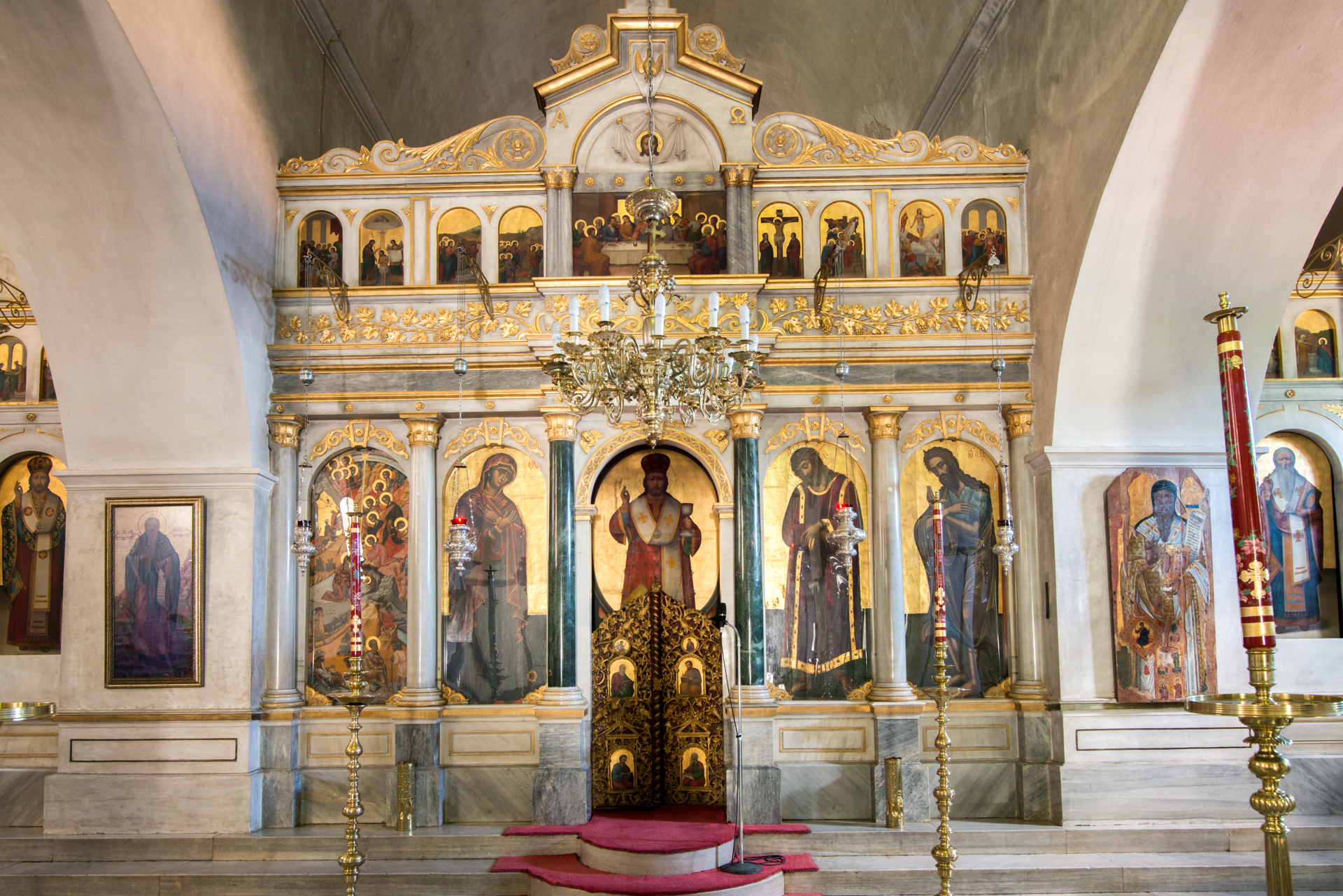 Το εσωτερικό του διακοσμείται με αξιόλογα έργα του 17ου και 18ου αιώνα, κυρίως φορητές εικόνες. Το μαρμάρινο τέμπλο του, έργο του Γεωργίου Καπαριά από την Τήνο, κατασκευάσθηκε το 1901, και αντικατέστησε το παλαιότερο ξυλόγλυπτο. Το σημαντικότερο κειμήλιο του ναού είναι η περίφημη μεγάλη εικόνα του Ελκόμενου, που χρονολογείται στον 14ο αιώνα και αποτελεί υψηλό καλλιτεχνικό δείγμα της ζωγραφικής του τέλους της εποχής των Παλαιολόγων. Η εικόνα, που είχε κλαπεί το 1979 και μετά την εύρεση και την αποκατάστασή της φυλασσόταν στο Βυζαντινό Μουσείο Αθηνών, επέστρεψε στον φυσικό της χώρο το 2011 και εκτίθεται στο παρεκκλήσιο του Αγίου Ιωάννη.