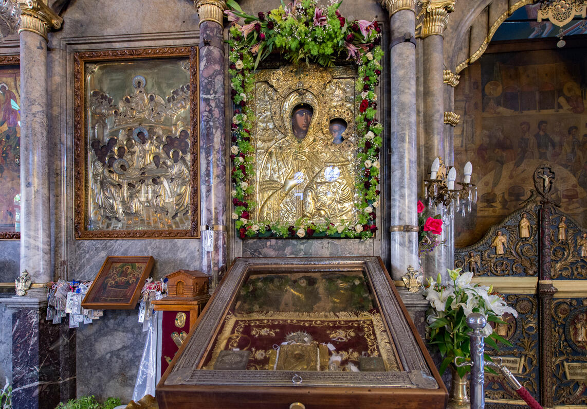 Το εσωτερικό του ναού έχει πλούσιο διάκοσμο που ολοκληρώθηκε το 1838, όπως αναφέρει επιγραφή στον νάρθηκα. Το θαυμάσιο μαρμάρινο τέμπλο αρχικά ήταν μικρότερο σε ύψος και το ανώτερο τμήμα του είναι ξύλινη προσθήκη με τόσο καλή επεξεργασία που δεν επιτρέπει τη διάκριση των υλικών. Σε ιδιαίτερο προσκυνητάρι φυλάσσεται η εικόνα της Παναγίας, η παλαιά εικόνα που αποκαλύφθηκε κρυμμένη σε ειδική θήκη πίσω από το πιστό αντίγραφό της, ενώ υπάρχουν πολλές ακόμη αξιόλογες φορητές εικόνες που χρονολογούνται από τον 10ο έως τον 19ο αιώνα. Ο ναός πλαισιώνεται από ξενώνα, πνευματικό κέντρο, λαογραφικό και εκκλησιαστικό μουσείο με πολλά και πολύτιμα κειμήλια, και πανηγυρίζει στις 15 Αυγούστου.