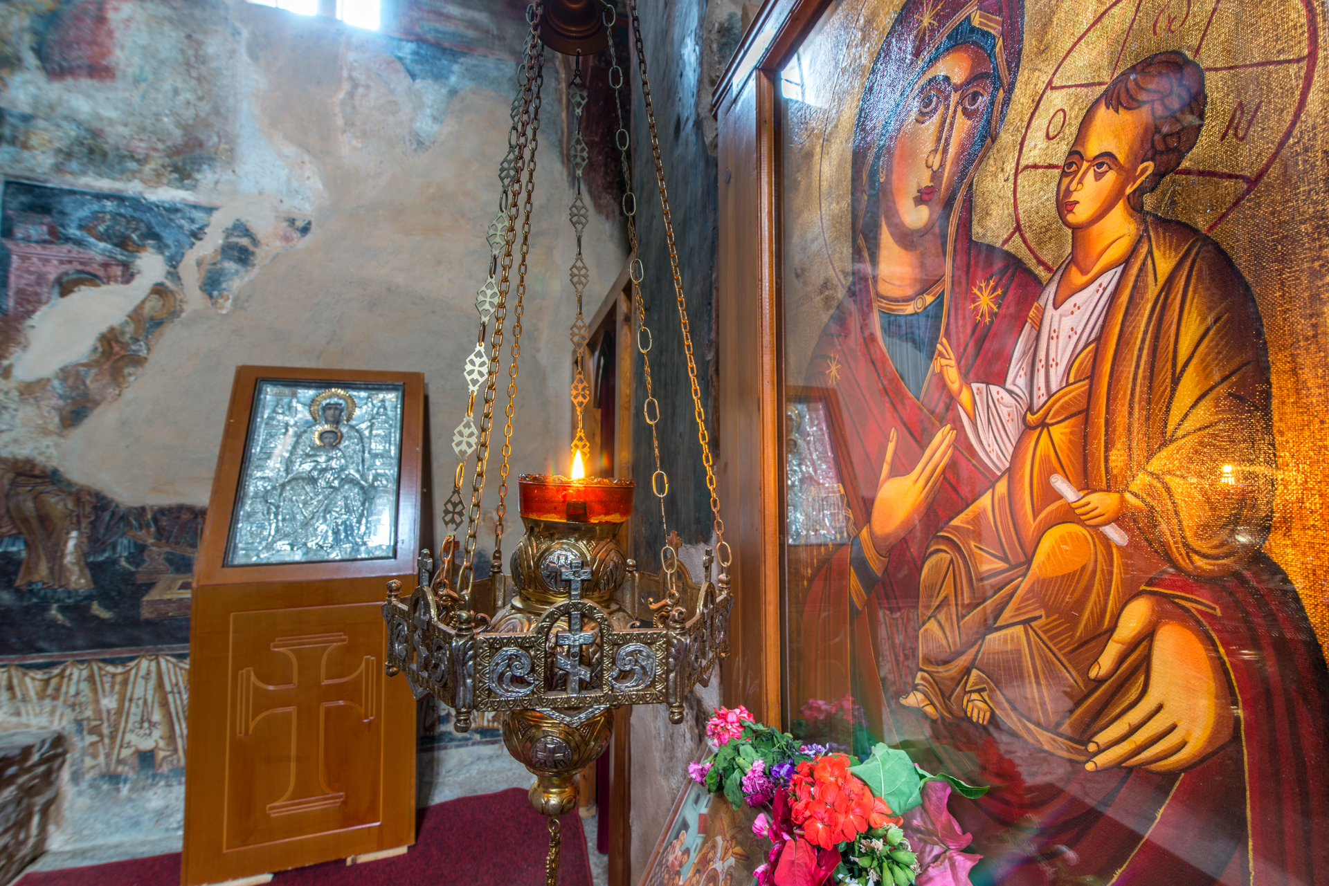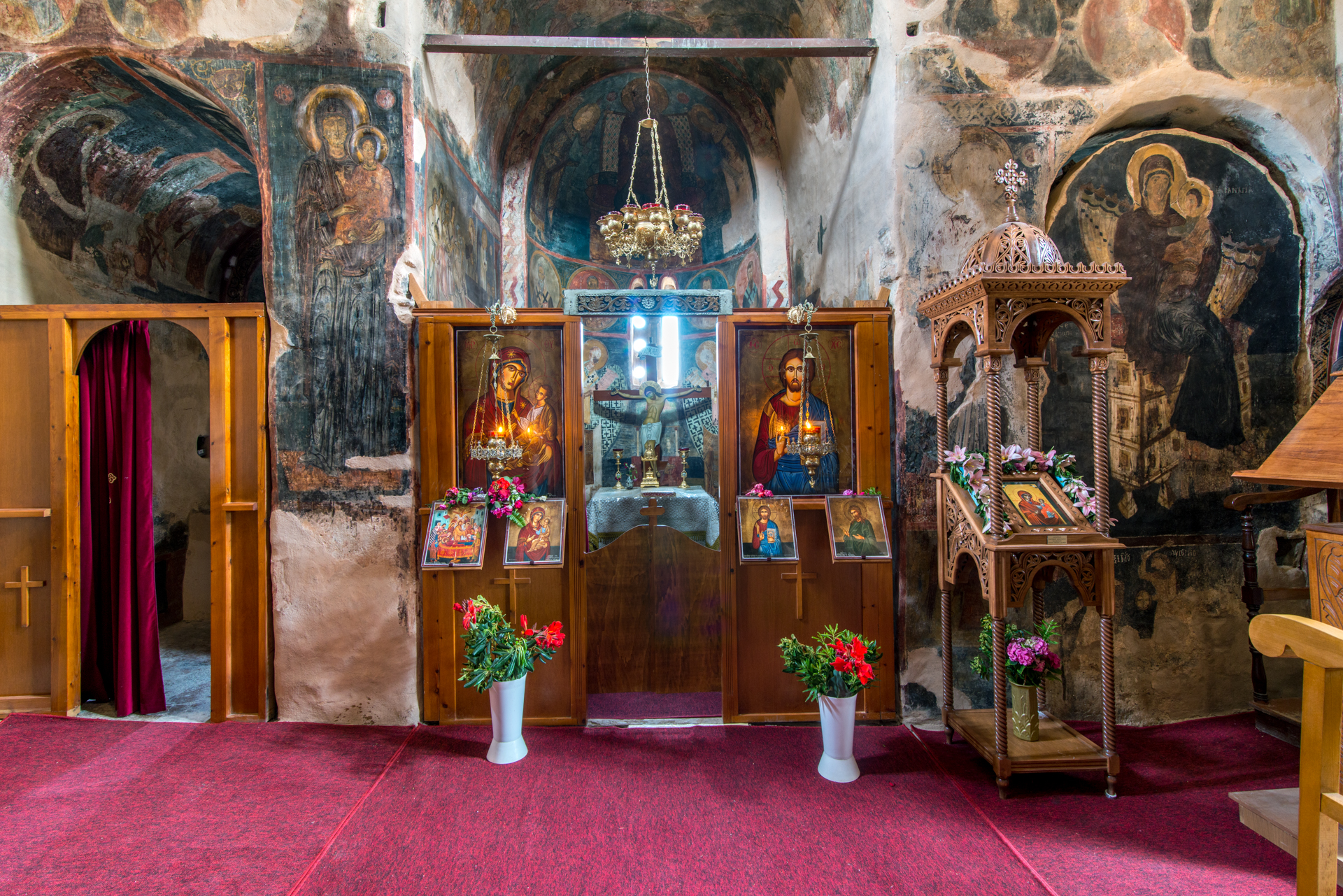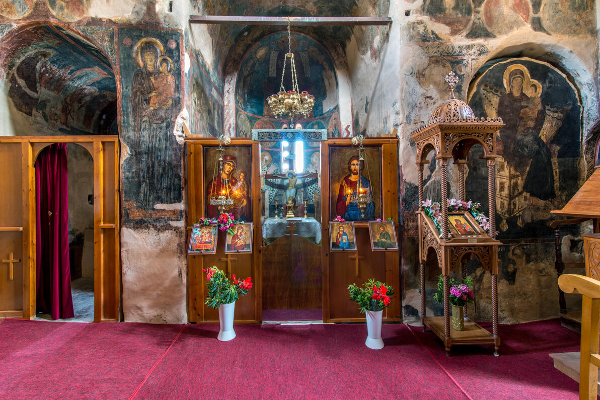 Το εσωτερικό του είναι κατάγραφο με καλής ποιότητας τοιχογραφίες που παρά τον επαρχιακό τους χαρακτήρα αποτελούν ιδιαίτερα ενδιαφέρον εικονογραφικό σύνολο. Χρονολογούνται με ακρίβεια στο 1289/90, σύμφωνα με την κτητορική επιγραφή, που αναφέρει και τους χορηγούς, τον τοπικό αξιωματούχο «σεβαστό» Μιχαήλ και τη σύζυγό του Ζωή. Οι παραστάσεις διατηρούνται αποσπασματικά στον κυρίως ναό και σε καλύτερη κατάσταση στον νάρθηκα, όπου εικονίζονται μεταξύ άλλων και οι κτήτορες. Σε ορισμένα σημεία υπάρχει και νεότερο στρώμα αγιογράφησης, που χρονολογείται στον 17ο αιώνα.
