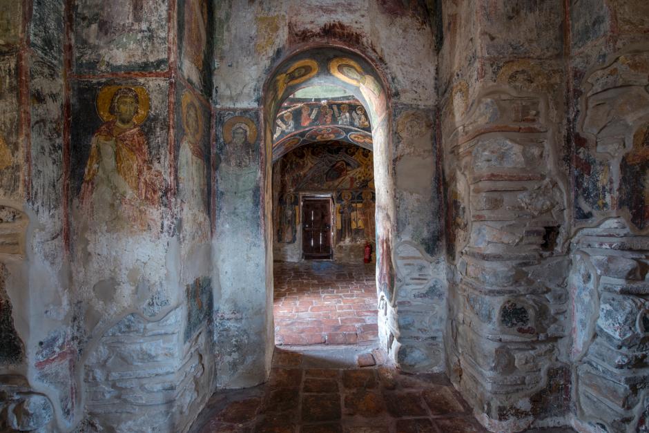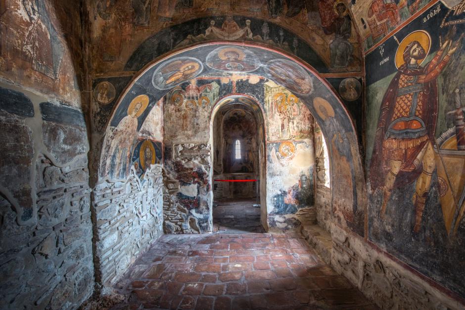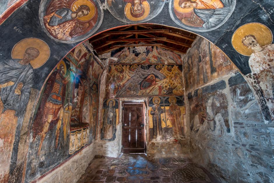Το εσωτερικό του ναού, όπως και η εξωτερική δυτική πλευρά του, είναι κατάγραφα με αξιόλογες τοιχογραφίες, οι οποίες όμως έχουν υποστεί αρκετές φθορές από την υγρασία. Στον κυρίως ναό σώζονται σκηνές από τη ζωή του Χριστού (Δωδεκάορτο) και άγιοι, και στον νάρθηκα εικονίζονται επεισόδια από τον βίο της Παναγίας. Ιδιαίτερο ενδιαφέρον παρουσιάζει η απεικόνιση της Αγίας Τριάδας στην καμάρα του νάρθηκα, που αποτελεί ένα από τα παλαιότερα βυζαντινά παραδείγματα ανθρωπόμορφης Αγίας Τριάδας, με τον υπερμεγέθη Θεό Πατέρα καθισμένο σε τόξο και μπροστά στο στήθος Του τον Χριστό Υιό, κρατώντας την Περιστερά του Αγίου Πνεύματος, να περιβάλλονται από δόξα. Οι τοιχογραφίες αυτές χρονολογούνται στα μέσα του 13ου αιώνα, ενώ εκείνες στον εξωνάρθηκα ανάγονται στον 17ο αιώνα. Η εικονογράφηση στον δυτικό εξωτερικό τοίχο της εκκλησίας είναι μεταγενέστερη και, όπως μας πληροφορεί η σχετική επιγραφή, έγινε με δαπάνη κάποιου Ανδρόνικου το έτος 1496.