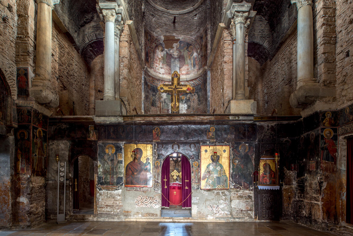 Η εσωτερική του διαμόρφωση είναι μοναδική καθώς συνδυάζονται με μοναδική κομψότητα δύο αρχιτεκτονικοί τύποι: Στο κάτω μέρος, με τις οκτώ παραστάδες αποκτά τη μορφή οκταγωνικού ναού. Στο άνω μέρος, μέσω ενός συστήματος δύο επάλληλων σειρών κιόνων, μετασχηματίζεται σε σταυροειδή εγγεγραμμένο ναό με τρούλο. Διαθέτει διόροφο περίστωο (γυναικωνίτη), το οποίο στη βόρεια και νότια πλευρά απολήγει στα παρεκκλήσια του Αρχαγγέλου Μιχαήλ και του Τιμίου Προδρόμου αντίστοιχα.
