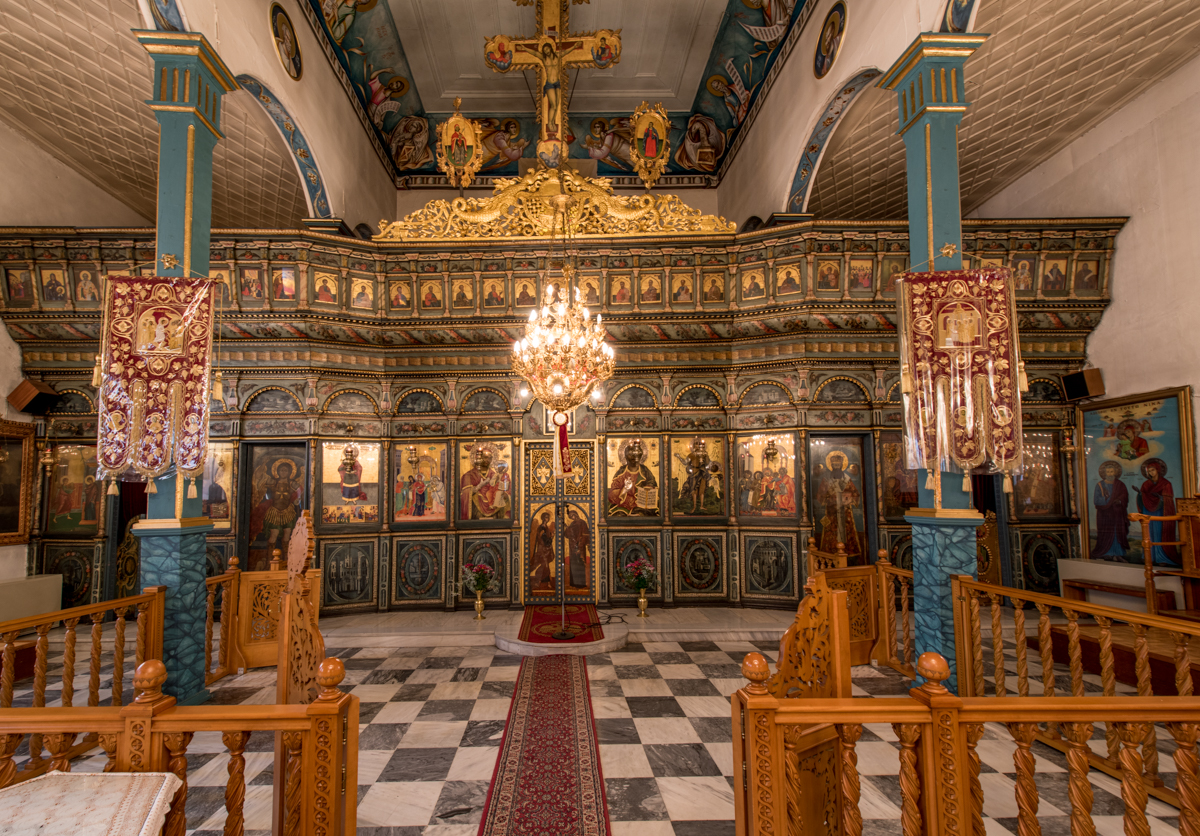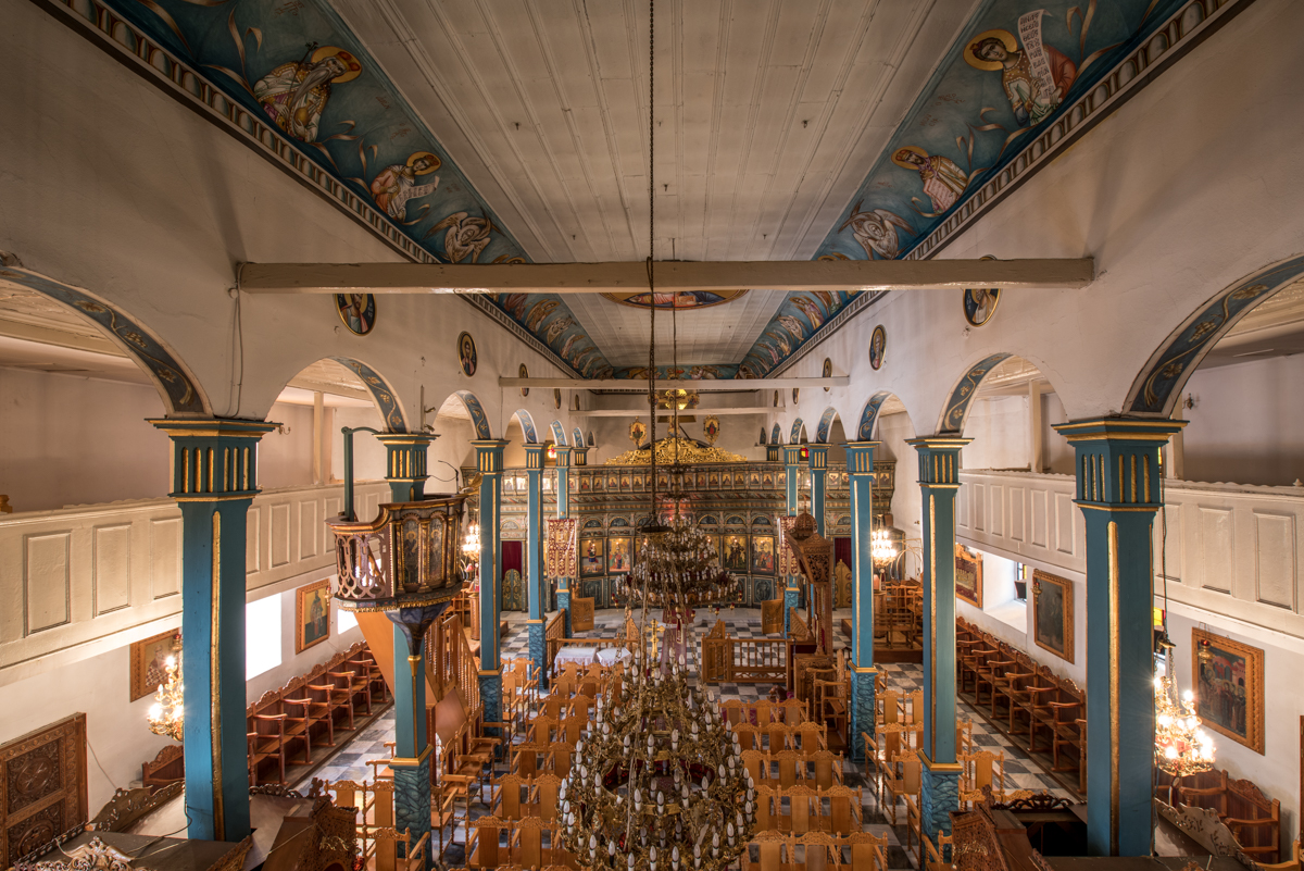 Στο εσωτερικό διατηρούνται το τέμπλο του έτους 1841, ο δεσποτικός θρόνος, ο άμβωνας και τα προσκυνητάρια. Στο τέμπλο έχουν τοποθετηθεί παλαιότερες εικόνες. Ιδιαίτερο ενδιαφέρον έχει το βημόθηρο της Ωραίας Πύλης με την παράσταση του Ευαγγελισμού, έργο της Κρητική Σχολής του 16ου αιώνα.