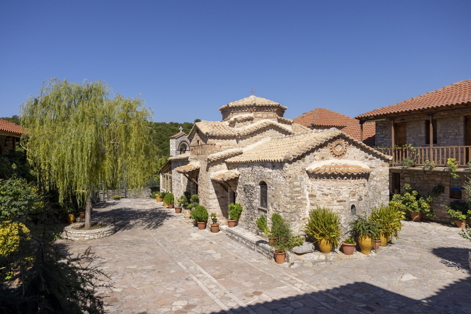 Σήμερα το μοναστηριακό συγκρότημα περιβάλλεται από ψηλά κτήρια με κελιά και βοηθητικούς χώρους και στο κέντρο του βρίσκεται το καθολικό. Ο ναός έχει περάσει πολλές φάσεις μέχρι να λάβει τη σημερινή του μορφή. Στον 12ο αιώνα ήταν απλός, μονόχωρος, καμαροσκεπής, εσωτερικά διακοσμημένος με τοιχογραφίες από τις οποίες σώζονται ελάχιστα τμήματα, ενώ το 1491 αγιογραφήθηκε εκ νέου από τον Ξένο Διγενή από το Μουχλί της Πελοποννήσου.