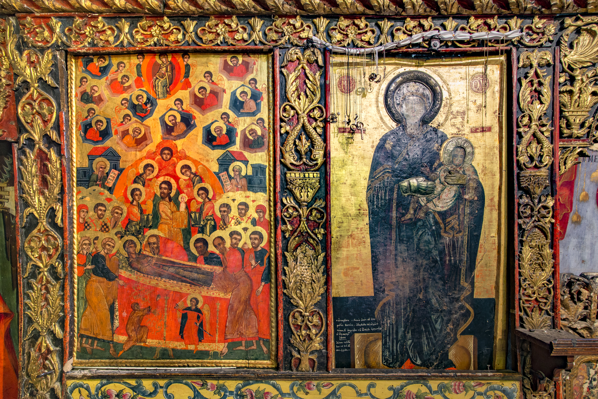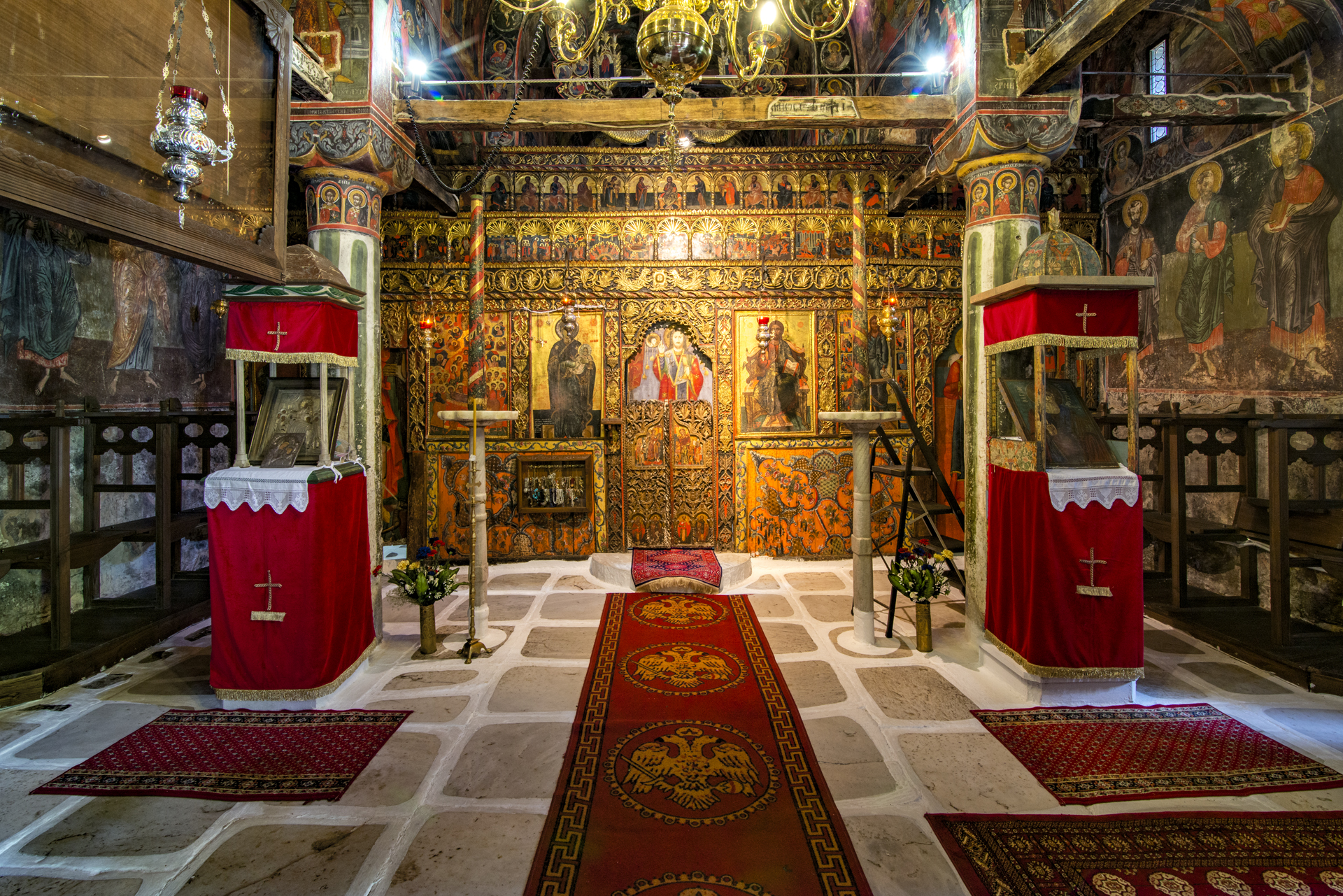 Στο εσωτερικό, ο ναός είναι κατάγραφος και ο διάκοσμός του ανήκει σε δύο φάσεις. Στην πρώτη, του 1650, χρονολογούνται οι τοιχογραφίες του κεντρικού τμήματος του κυρίως ναού, του τρούλου και των χορών, που είναι έργο των αγιογράφων Νικόλαου και Ιωάννη. Το υπόλοιπο τμήμα του ναού και τον νάρθηκα αγιογράφησαν το 1658 οι ζωγράφοι Μιχάλης από τη Ζέρμα Ηπείρου και Ηλίας από το Επταχώρι Καστοριάς. Οι τοιχογραφίες του εξωνάρθηκα είναι έργο του 1911 και έγιναν από τον ζωγράφο Γεώργιο Πιτένη από τη Σαμαρίνα. Αξιόλογα έργα ξυλογλυπτικής του 17ου αιώνα είναι το τέμπλο, η πόρτα και τα παράθυρα του ναού.