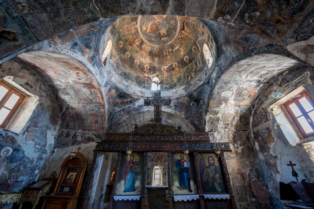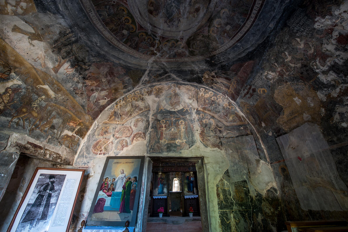 Στο εσωτερικό του σώζονται αξιόλογες τοιχογραφίες του 1635, έργο του Δημητρίου Κακαβά, ενός από τους πιο σπουδαίους ζωγράφους της εποχής στην Πελοπόννησο. Στον ναό φυλάσσεται η εικόνα της Παναγίας Μαρδακιώτισσας, που βρέθηκε το 1867 από τον τότε δήμαρχο Αλαγονίας και θεωρείται έργο του ευαγγελιστή Λουκά. Επίσης, δεξιά της εισόδου είναι εντοιχισμένα τα λείψανα του Πατριάρχη Προκόπιου, που καταγόταν από την Αλαγονία.
