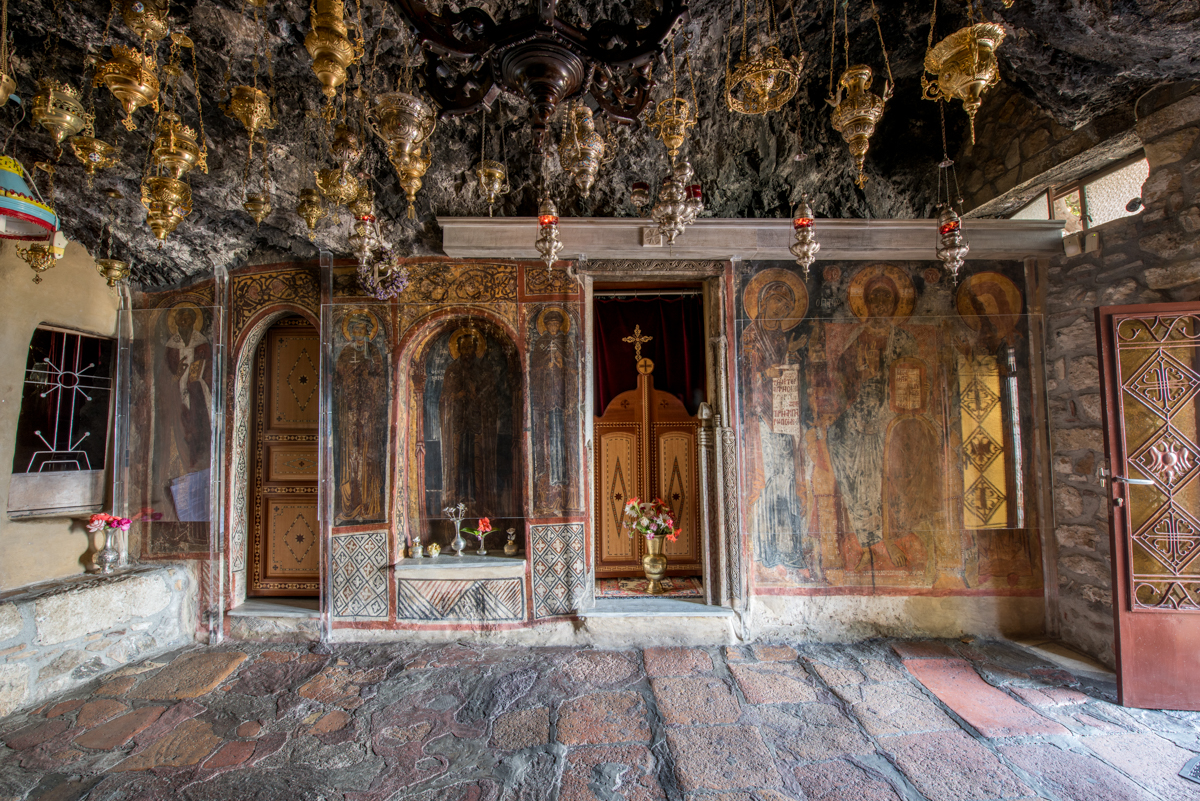 Η πρόσβαση στο συγκρότημα γίνεται μέσω μιας μεγάλης ελικοειδούς κλίμακας με περίπου 150 σκαλοπάτια. Το σπήλαιο αποτελεί το κέντρο του ενδιαφέροντος. Στο εσωτερικό του φυλάσσεται το λείψανο του οσίου Παταπίου μέσα σε ξύλινη λάρνακα, ενώ από την οροφή του κρέμονται πολυάριθμα καντήλια, αφιερώματα των πιστών. Διαθέτει λιθόκτιστο τέμπλο με δύο πύλες και κοσμείται με μεταβυζαντινές τοιχογραφίες, πιθανώς του 15ου αιώνα. Μπροστά από το σπήλαιο είχε κτιστεί σύγχρονος ναός, αφιερωμένος στην Κοίμηση της Θεοτόκου, που έχει τη θέση καθολικού. Ανήκει στον τύπο της βασιλικής με τρούλο και στο εσωτερικό του φυλάσσεται η κάρα της Αγίας Υπομονής. Στον χώρο υπάρχουν ακόμη το νεκροταφείο με τον μικρό ναό της Αγίας Μαρίας της Αιγυπτίας, ξενώνας για τη φιλοξενία των επισκεπτών, πλούσια βιβλιοθήκη και εκθεσιακός χώρος.