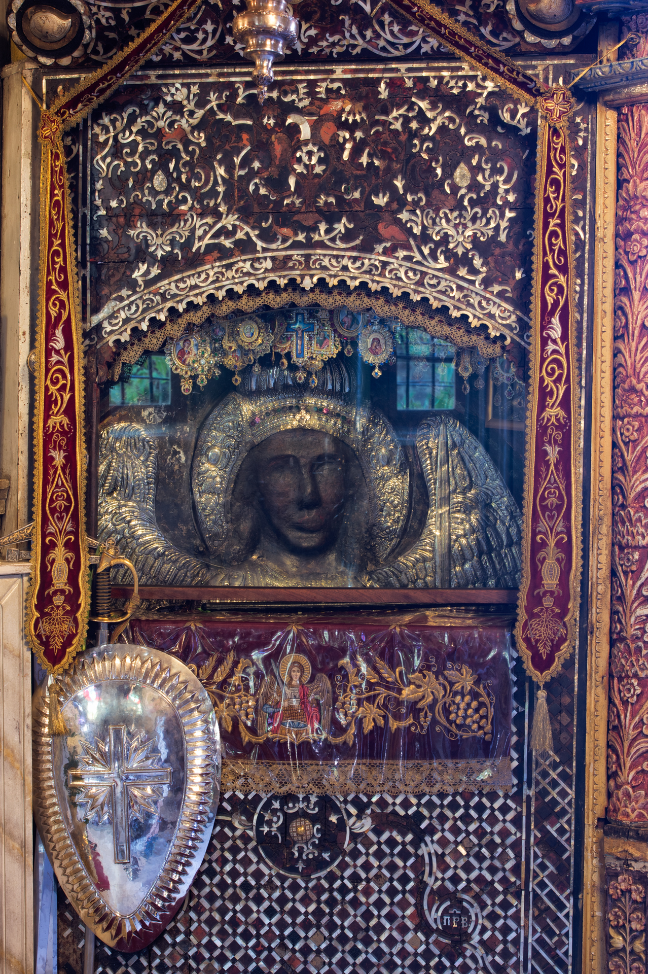 Στο εσωτερικό του κυρίαρχη θέση έχει η μοναδική στο είδος της ανάγλυφη εικόνα του Αρχαγγέλου Μιχαήλ, που φυλάσσεται μέσα σε πολυτελές κουβούκλιο κατασκευασμένο το 1766. Στον ναό φυλάσσεται και ο αρχιερατικός σάκος και το πετραχήλι του εθνομάρτυρα Πατριάρχη Γρηγορίου Ε΄, σε ειδική θέση στα δεξιά της εισόδου. Τα κειμήλια είχε δώσει ο ίδιος ο πατριάρχης στον πρωτοσύγκελλό του Πορφύριο, που αργότερα έγινε Μητροπολίτης Μυτιλήνης. Αξιοπρόσκετα είναι τα μικρά μεταλλικά υποδήματα που προσφέρουν στον ναό οι πιστοί, αφού σύμφωνα με την παράδοση ο Ταξιάρχης φθείρει τα υποδήματά του διατρέχοντας τη νύχτα το νησί.