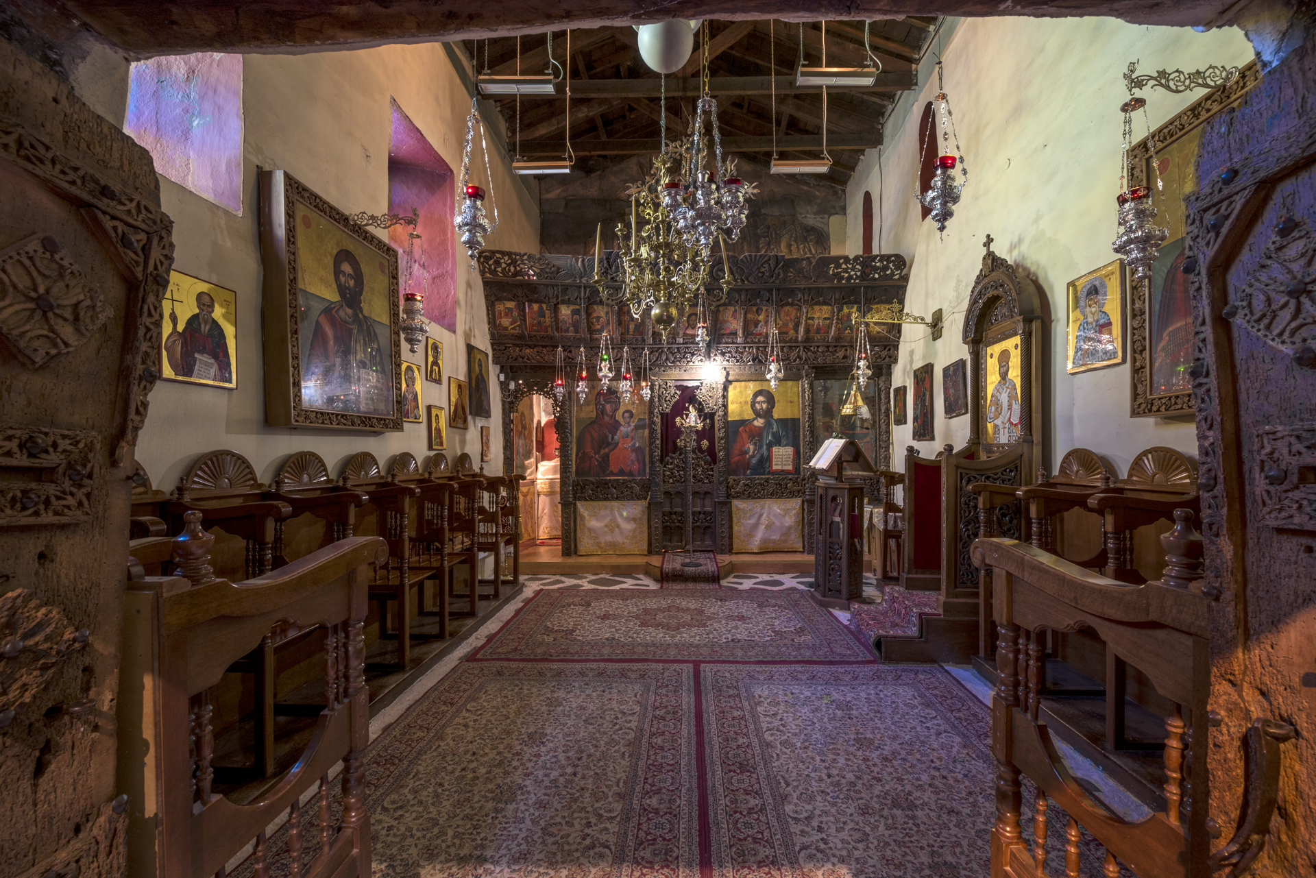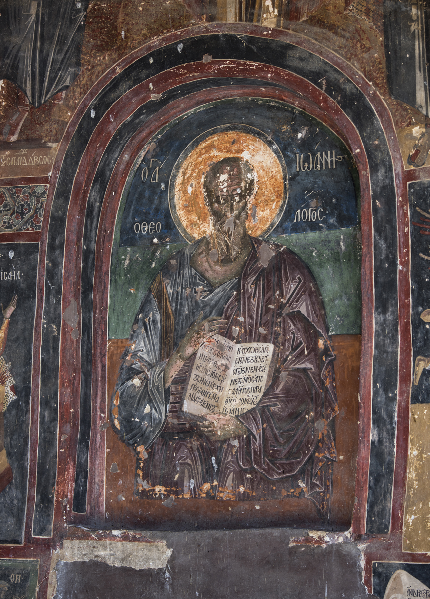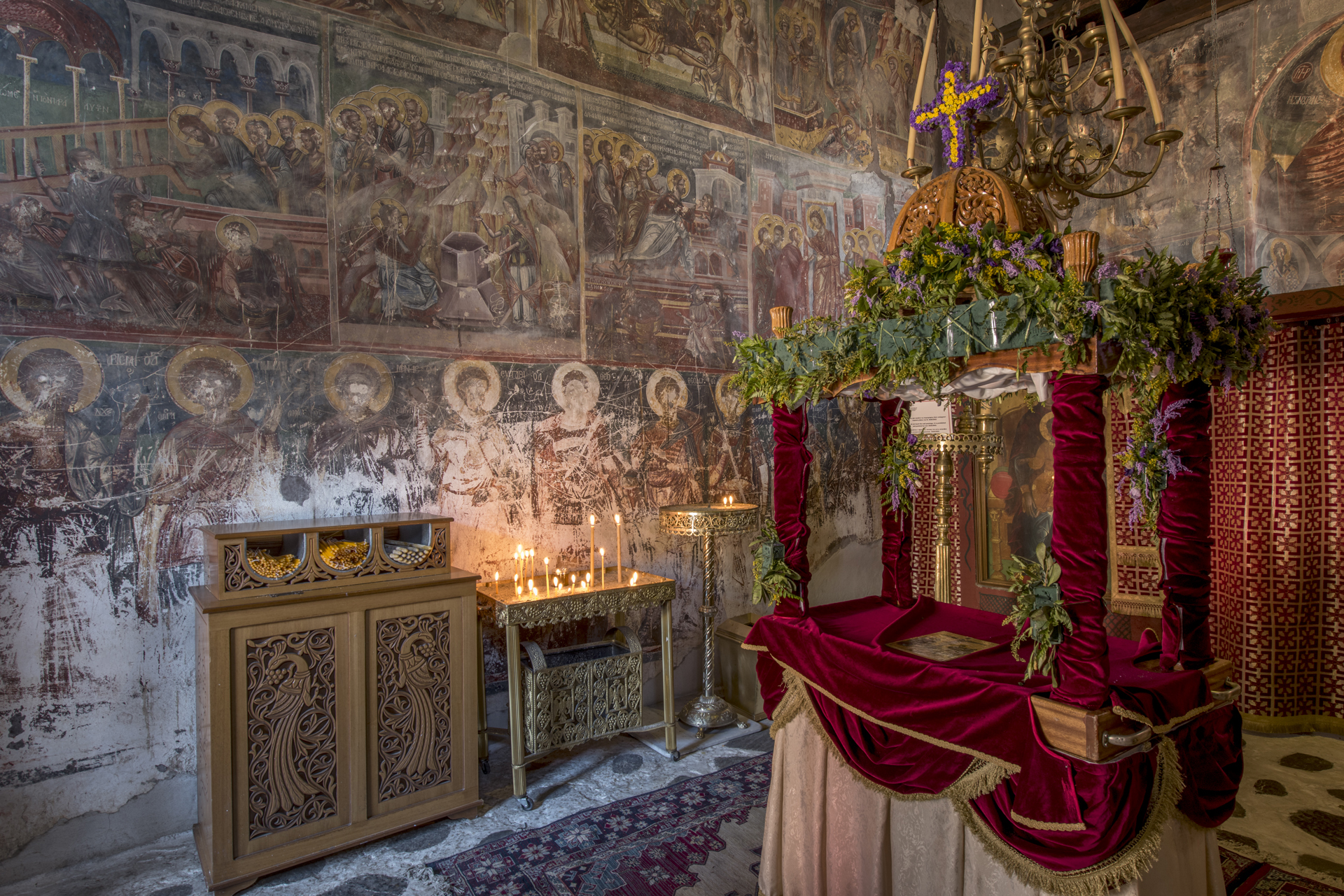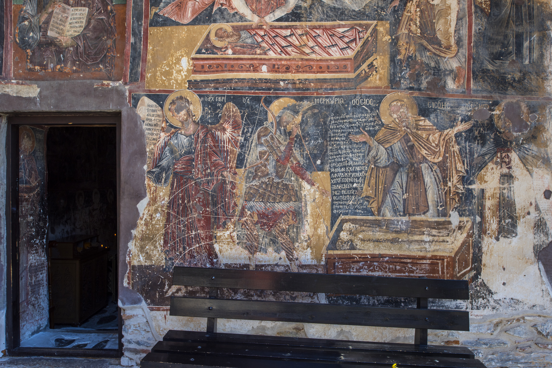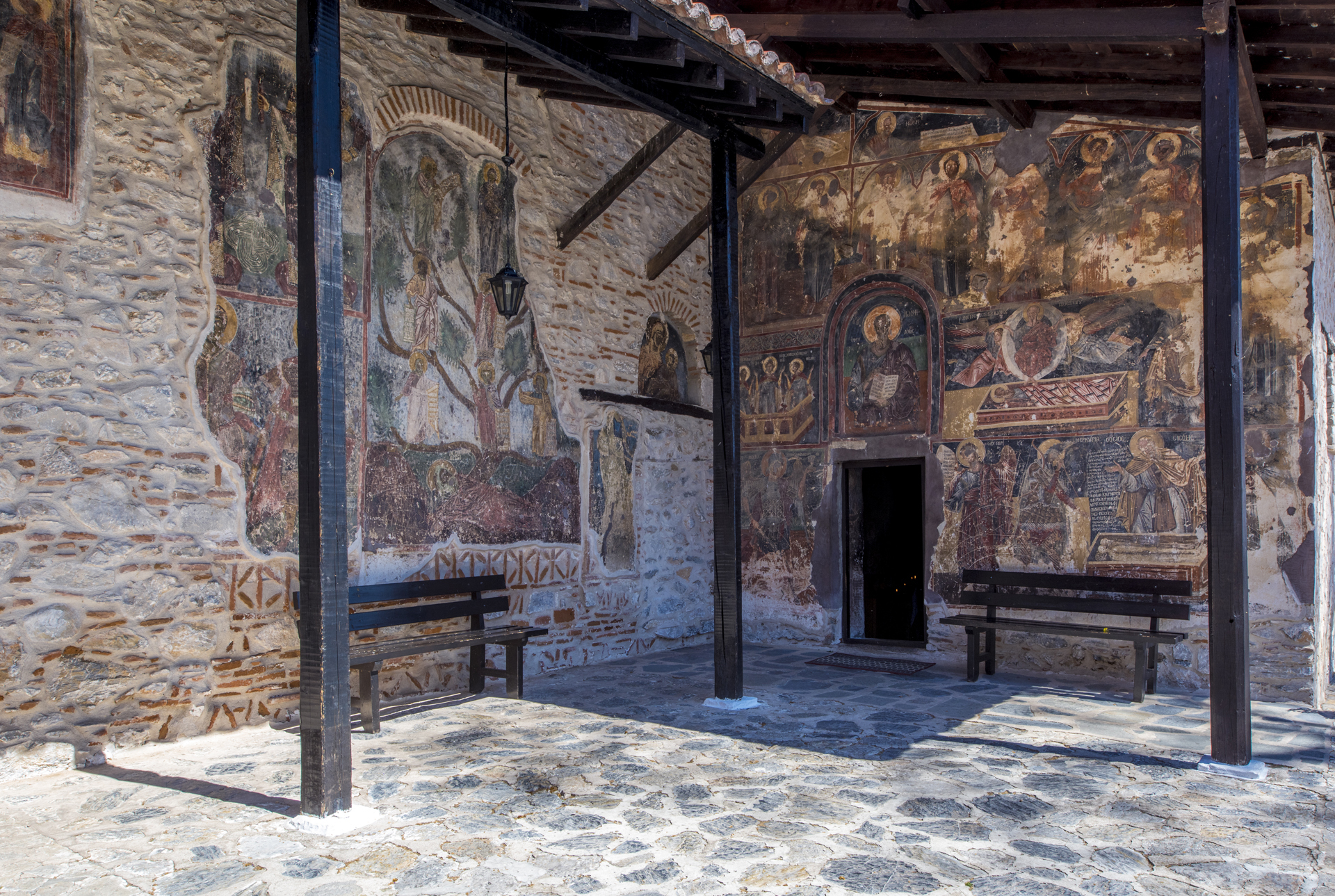 From the initial monastery very few buildings survive. The catholicon is an aisleless church with a large semicircular arch on the east. The “liti”, that is the spacious narthex on the western side, necessary at the catholica of the monasteries, was added at a later date. The interior or the church was decorated with wall paintings for which five painters are responsible. They date for the early 13th century and survive in fragments at the bema, the western wall of the main church, at the “liti”, as well as at the external side of the southern wall. The icons on the external side of the southern wall of the narthex can be dated in the period 1259-1264, a date that is supported by the fragments of inscriptions that accompany two figures, emperor Michael VIII Palaiologos (1259-1282) and his brother John. Later, in the 16th century, on the southern side of the catholicon they annexed and painted the chapel of Agios Ioannis Theologos.