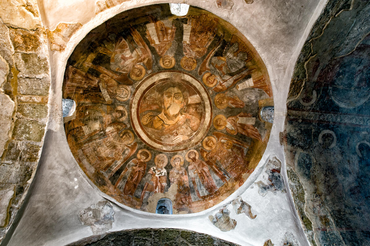 Внутри храма сохранились великолепные настенные росписи, различимы пять слоев, относящихся к периоду от VII по XIII век. Наиболее древние, раннехристианской эпохи, сохранились в алтарной нише. Интересно обратить внимание на декоративные кресты, выполненные в период иконоборчества (VIII –IX вв.). Затем следуют фрески 1052 года, частично снятые со стен, и более поздние, в куполе, с необычным изображением пророков и ангелов. Самые поздние сцены – это Деиси и Благовещение, находящиеся в алтаре и датируемые XIII веком. Фрески, относящиеся предположительно к 1056 году, сохранились в часовне Святого Акиндина.
